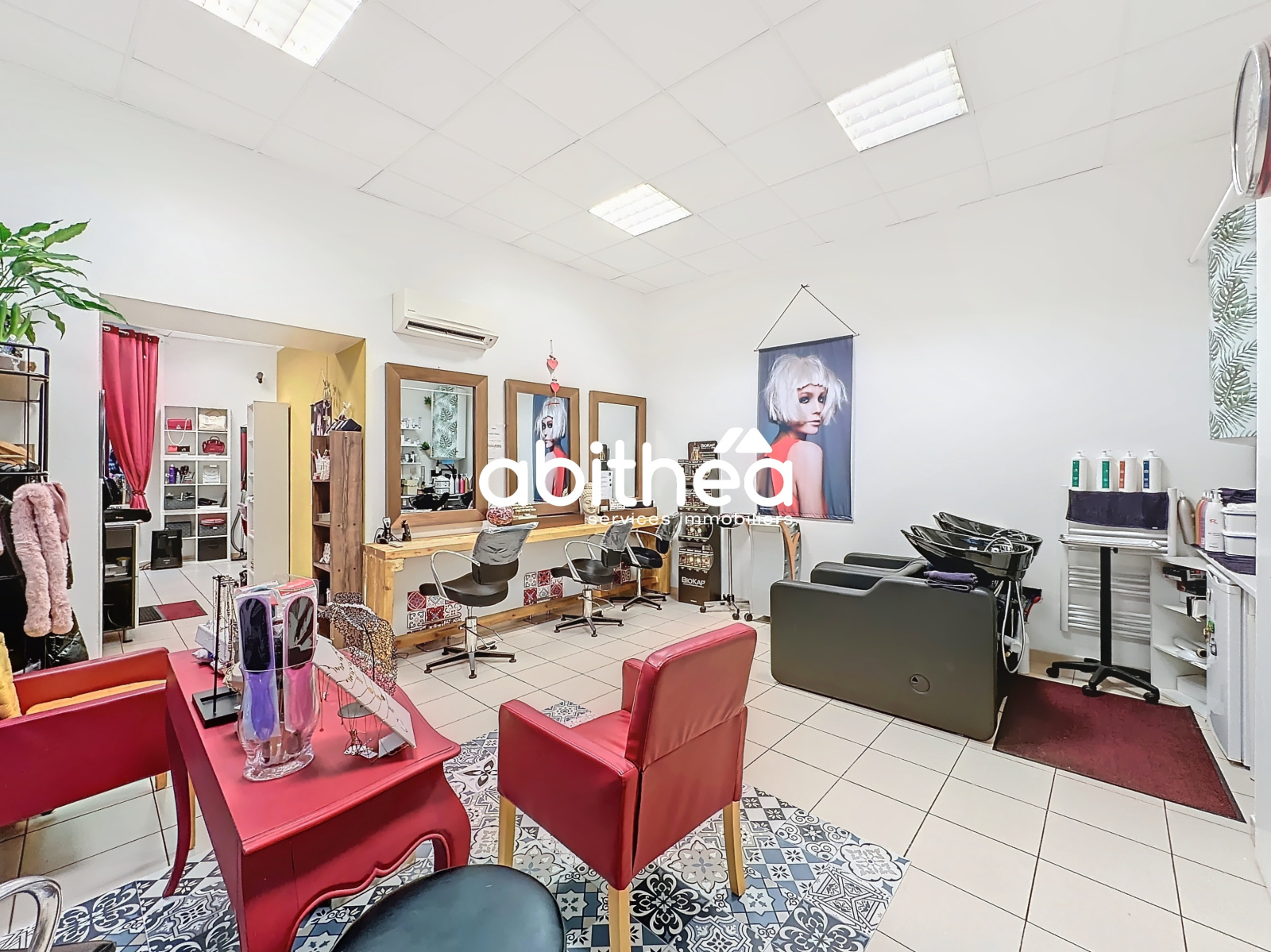 * 1 deuxième espace de 30 m2 qui comporte trois postes de coiffure, deux postes de shampoing, des espaces d'exposition/vente et une petite kitchenette