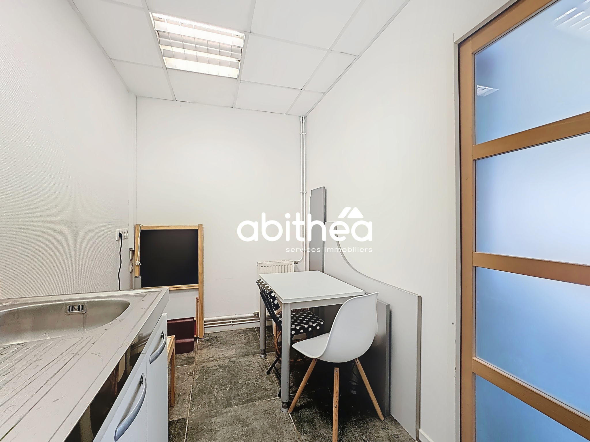 L’agencement comprend également une seconde entrée, deux toilettes dont une conforme aux normes PMR avec lave-mains, un local technique et une salle de repos.