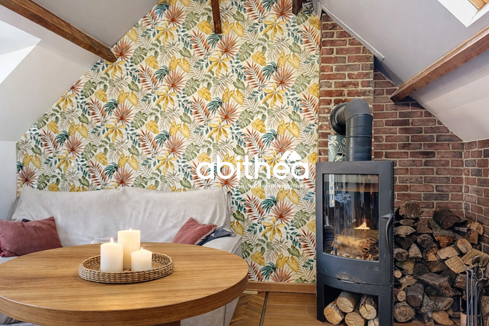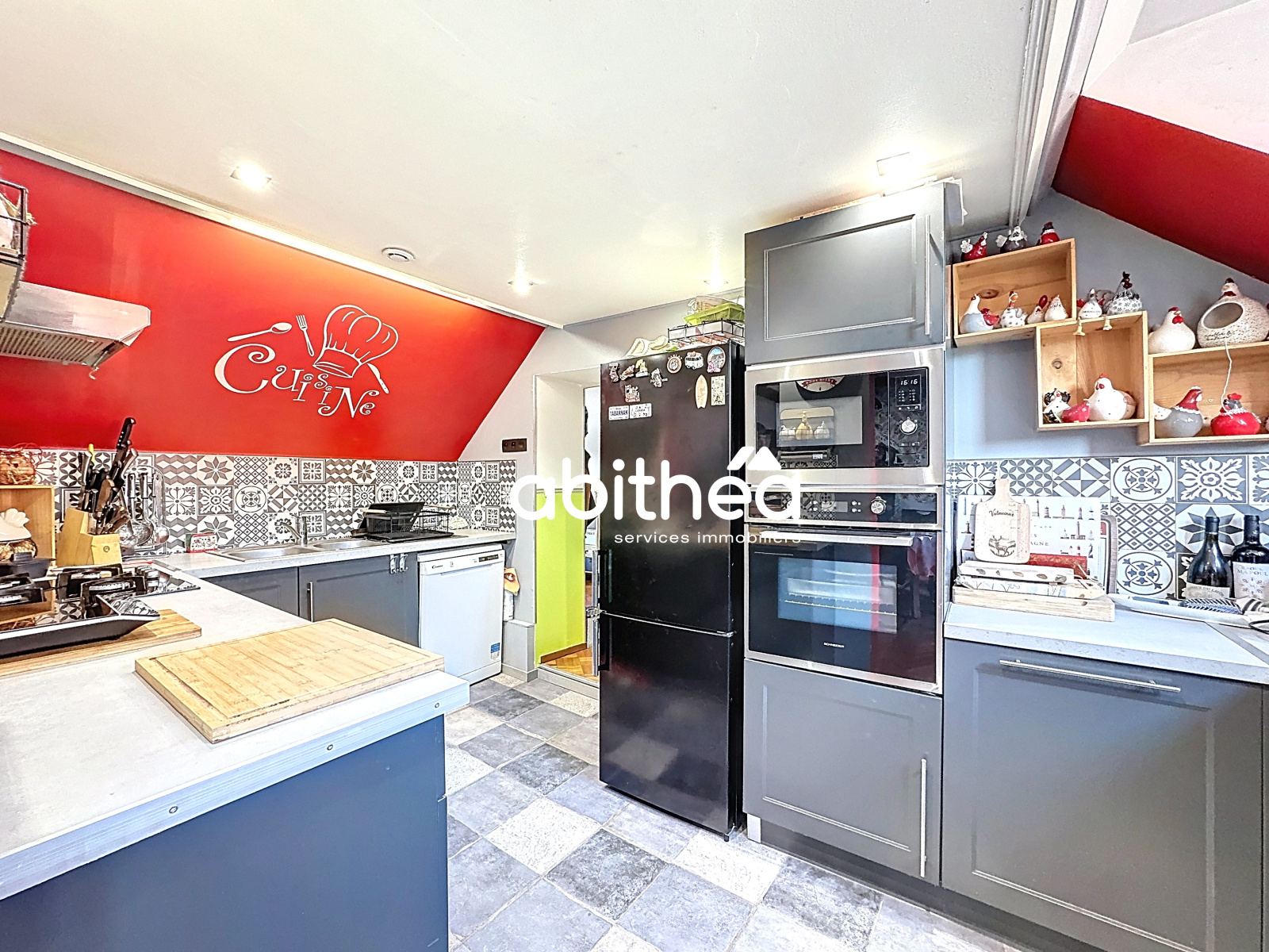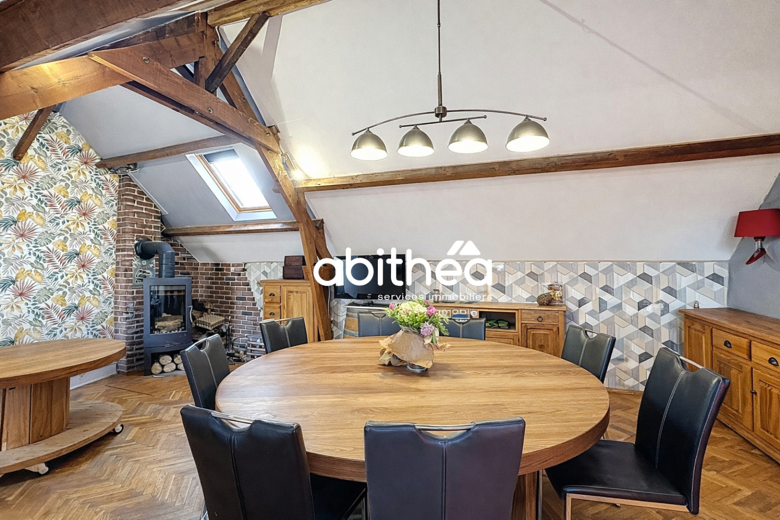 La partie habitation, située à l’étage, se compose d’un magnifique salon-séjour avec charpente apparente et parquet, offrant un volume et un cachet particulièrement agréables. Une cuisine fonctionnelle complète cet espace de vie, ainsi qu’un espace nuit comprenant trois belles chambres, une salle de bains avec baignoire et douche et un WC indépendant. Un palier aujourd’hui aménagé en bureau vient parfaire l’organisation de ce niveau.