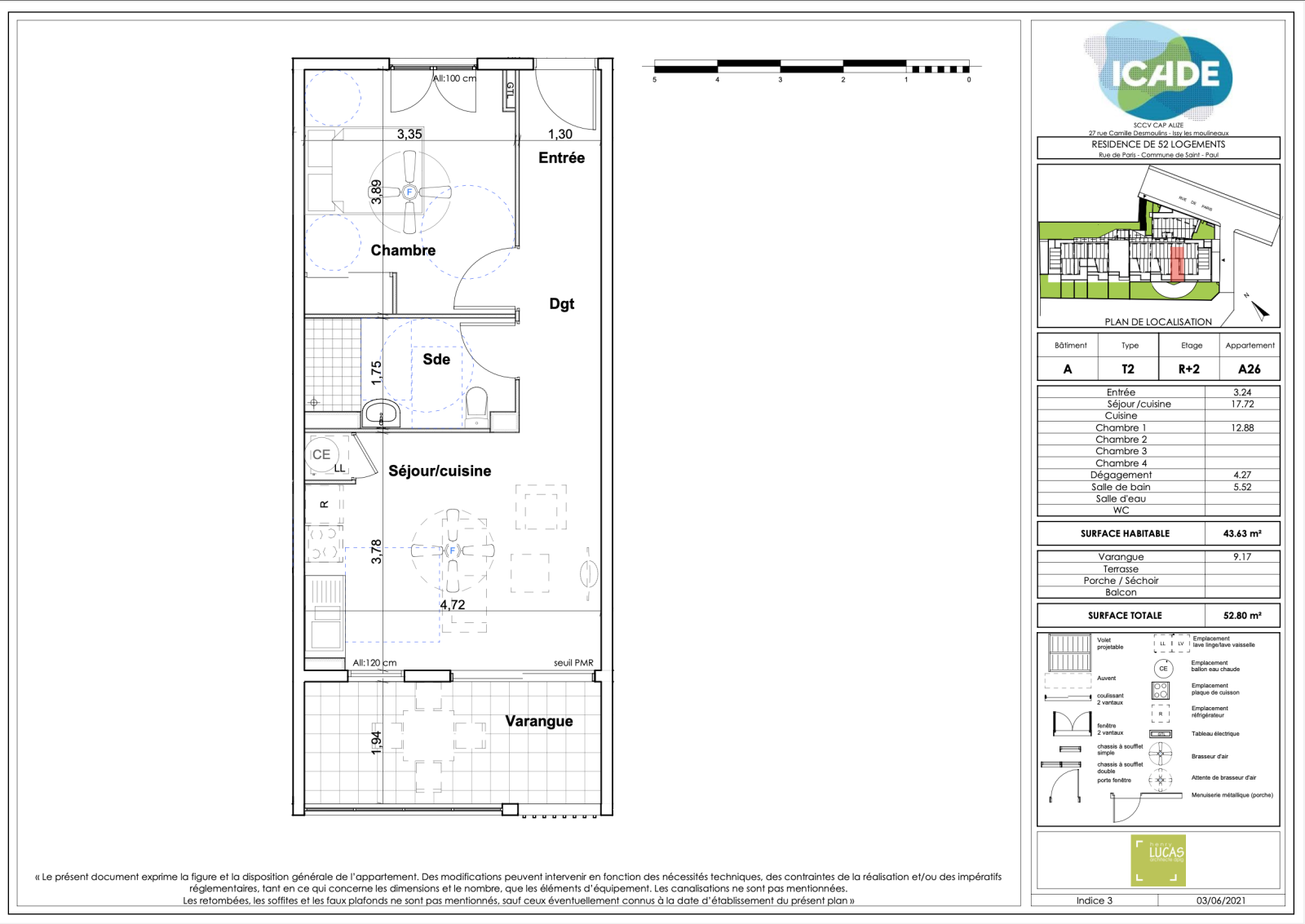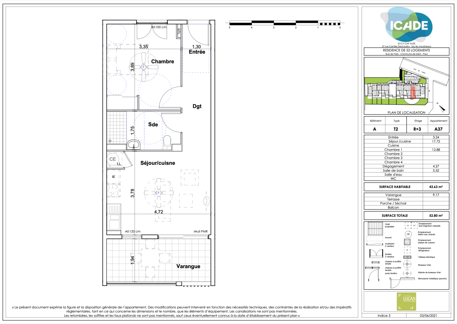- Lot n°A37 : T2 situé à R+3 d'une surface habitable de 43.63m2, disposant d'une cuisine ouverte sur le séjour de 17.72m2, d'une salle de bain + WC de 5.52m2 et d'une chambre de 12.88m2. La cuisine offre également accès à une varangue de 9.17m2.