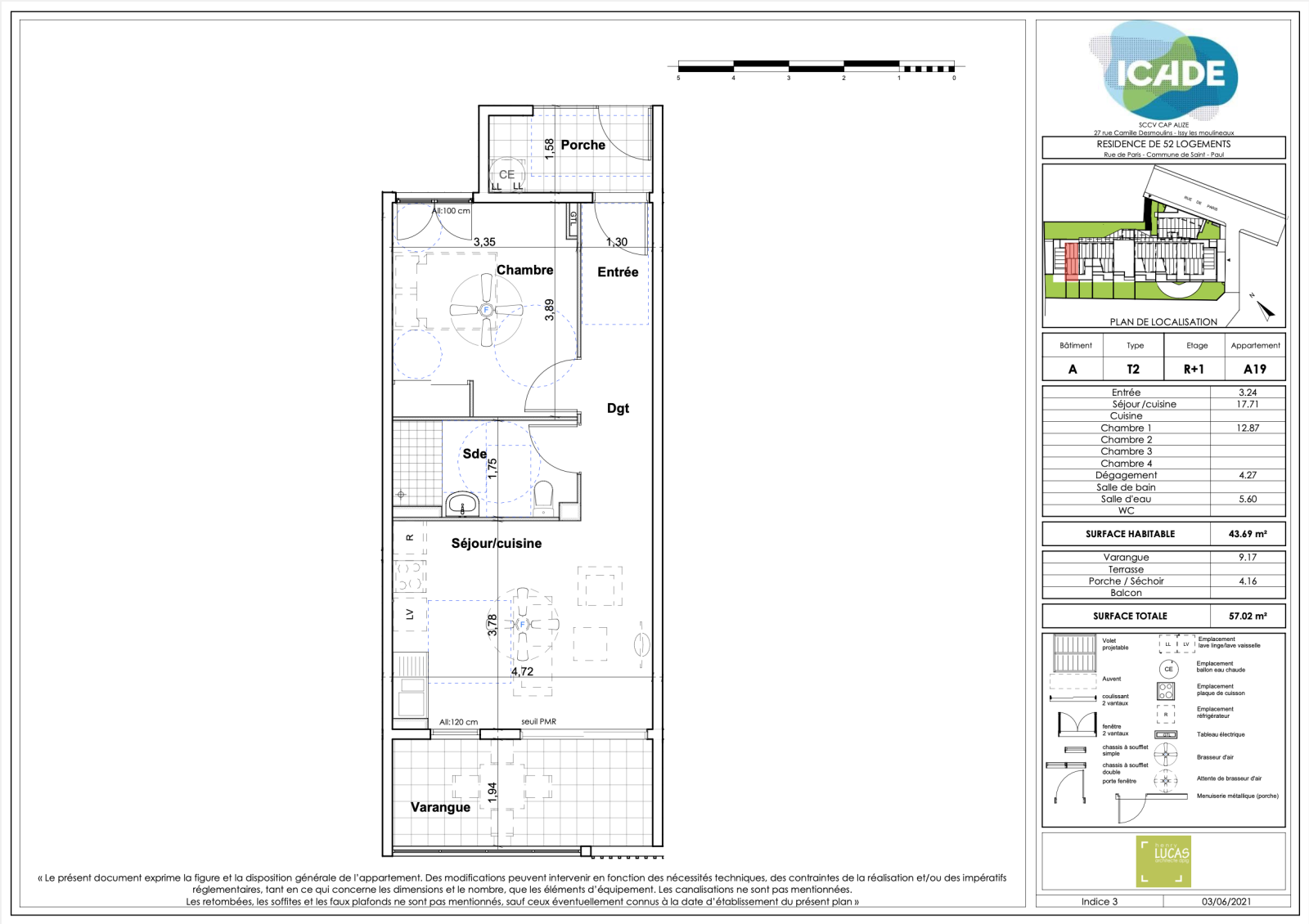 - Lot n°A19 : T2 situé à R+1 d'une surface habitable de 43.69m2, disposant d'une cuisine ouverte sur le séjour de 17.71m2, d'une salle d'eau+ WC de 5.60m2 et d'une chambre de 12.87m2, donnant sur un porshe de 4.16m2. La cuisine offre également accès à une varangue de 9.17m2.