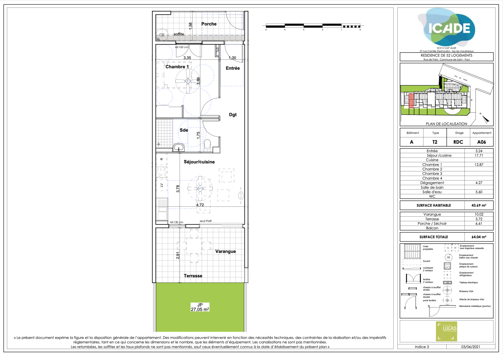 - Lot n°A06 : T2 situé au rez de chaussé d'une surface habitable de 43.69m2 disposant d'une cuisine ouverte sur le séjour d'une surface de 17.71m2, d'une salle d'eau + WC de 5.60m2 et d'une chambre de 12.87m2 donnant sur un proshe de 6.61m2. La cuisine donne également accès à une varangue + terrasse de 13.74m2, qui donne eux même accès à un jardin privatif de 27.05m2.