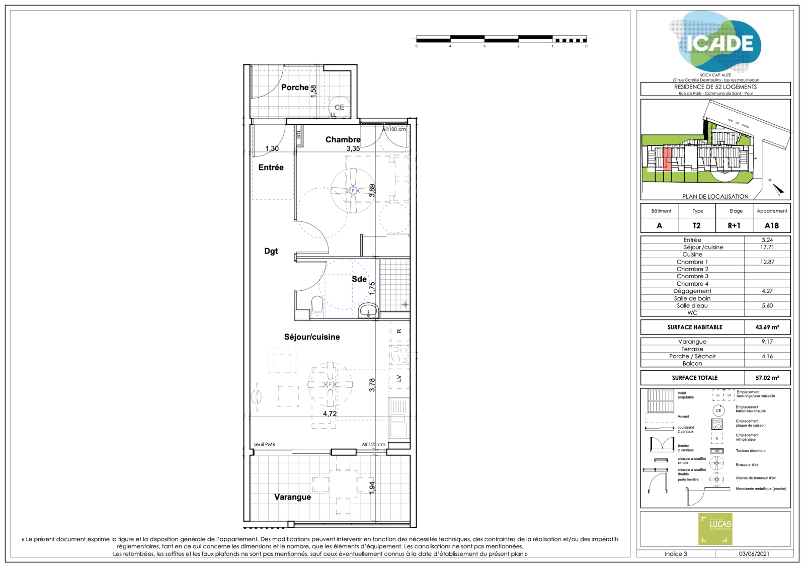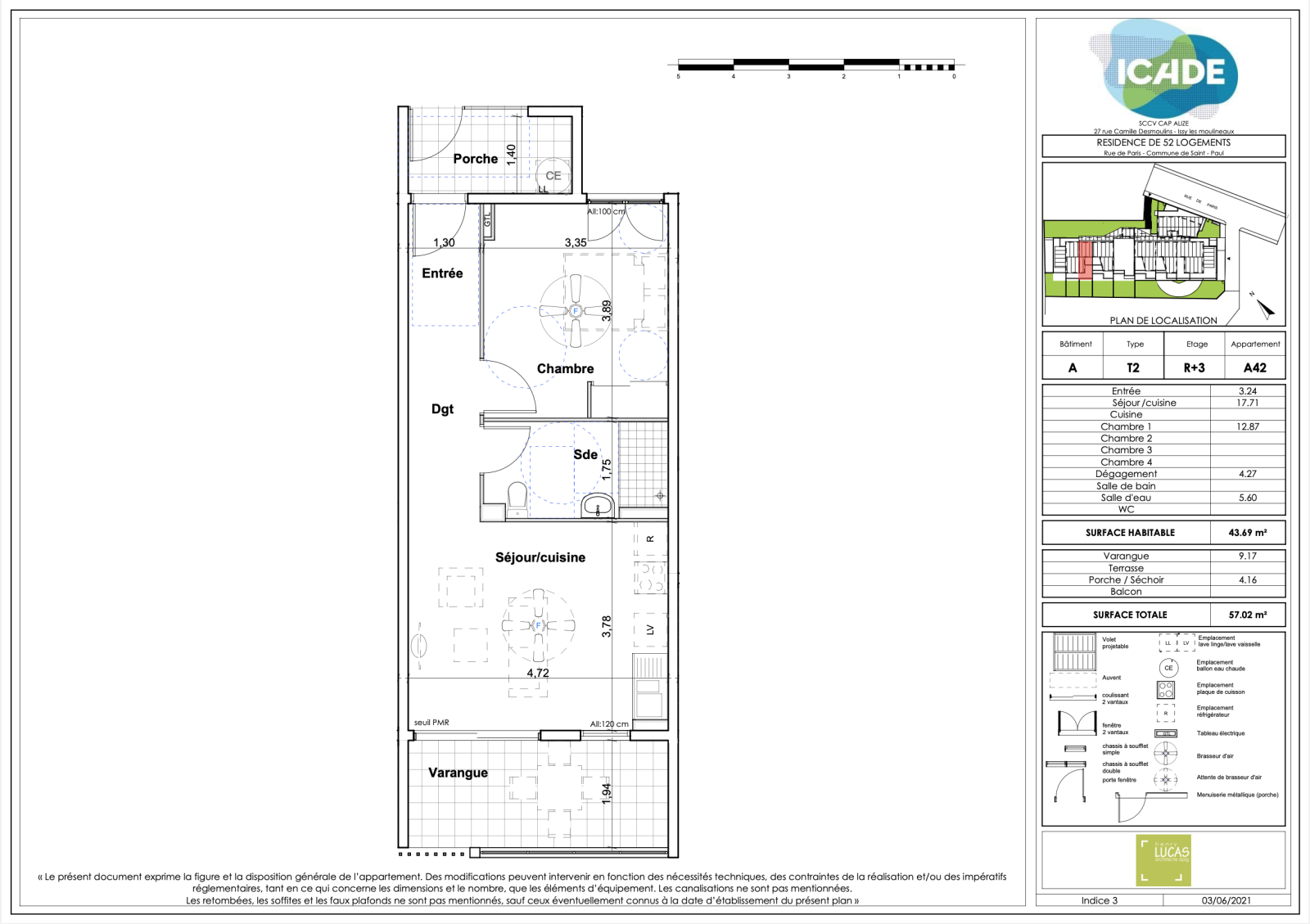 - Lot n°A42 : T2 situé à R+3 d'une surface habitable de 43.69m2, disposant d'une cuisine ouverte sur le séjour de 17.71m2, d'une salle d'eau + WC de 5.60m2 et d'une chambre de 12.88m2, donnant sur un porshe de 4.16m2. La cuisine offre également accès à une varangue de 9.17m2.