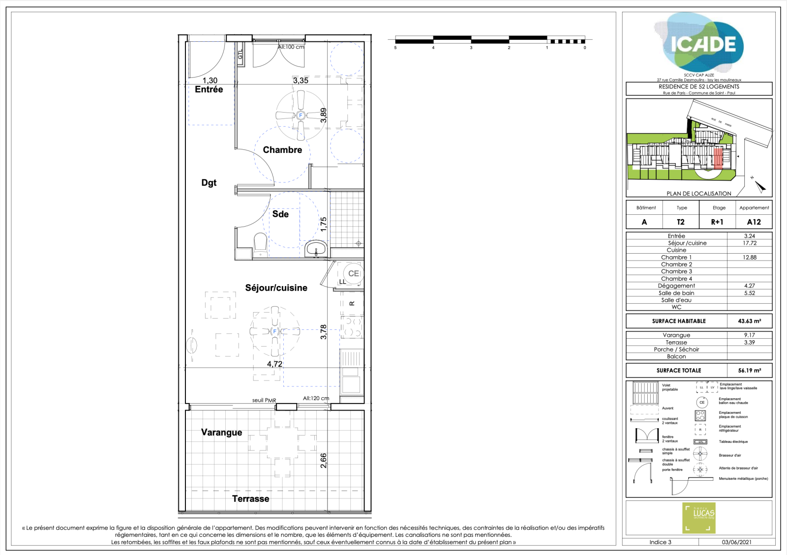 - Lot n°A12 : T2 situé à R+1 d'une surface habitable de 43.63m2, disposant d'une cuisine ouverte sur le séjour de 17.72m2, d'une salle de bain + WC de 5.52m2 et d'une chambre de 12.88m2. La cuisine offre également accès à une varangue + terrasse de 12.56m2.