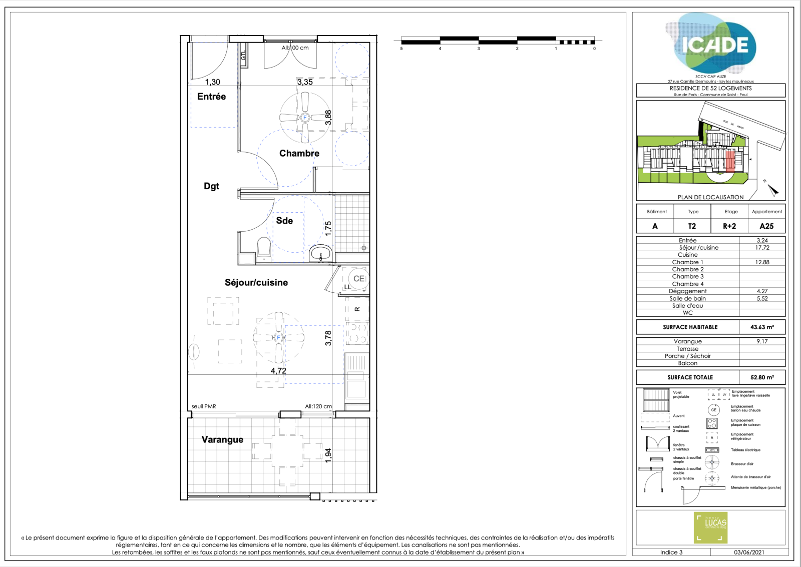 -Lot n°A25 : T2 situé à R+2 d'une surface habitable de 43.63m2, disposant d'une cuisine ouverte sur le séjour de 17.72m2, d'une salle de bain + WC de 5.52m2 et d'une chambre de 12.88m2. La cuisine offre également accès à une varangue de 9.17m2.