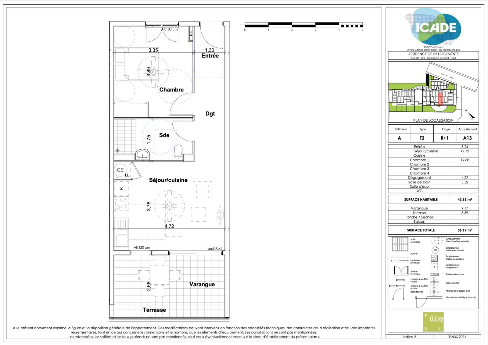 - Lot n°A13 : T2 situé à R+1 d'une surface habitable de 43.63m2, disposant d'une cuisine ouverte sur le séjour de 17.72m2, d'une salle de bain + WC de 5.52m2 et d'une chambre de 12.88m2. La cuisine offre également accès à une varangue + terrasse de 12.56m2.
