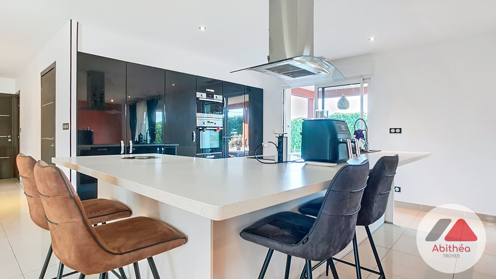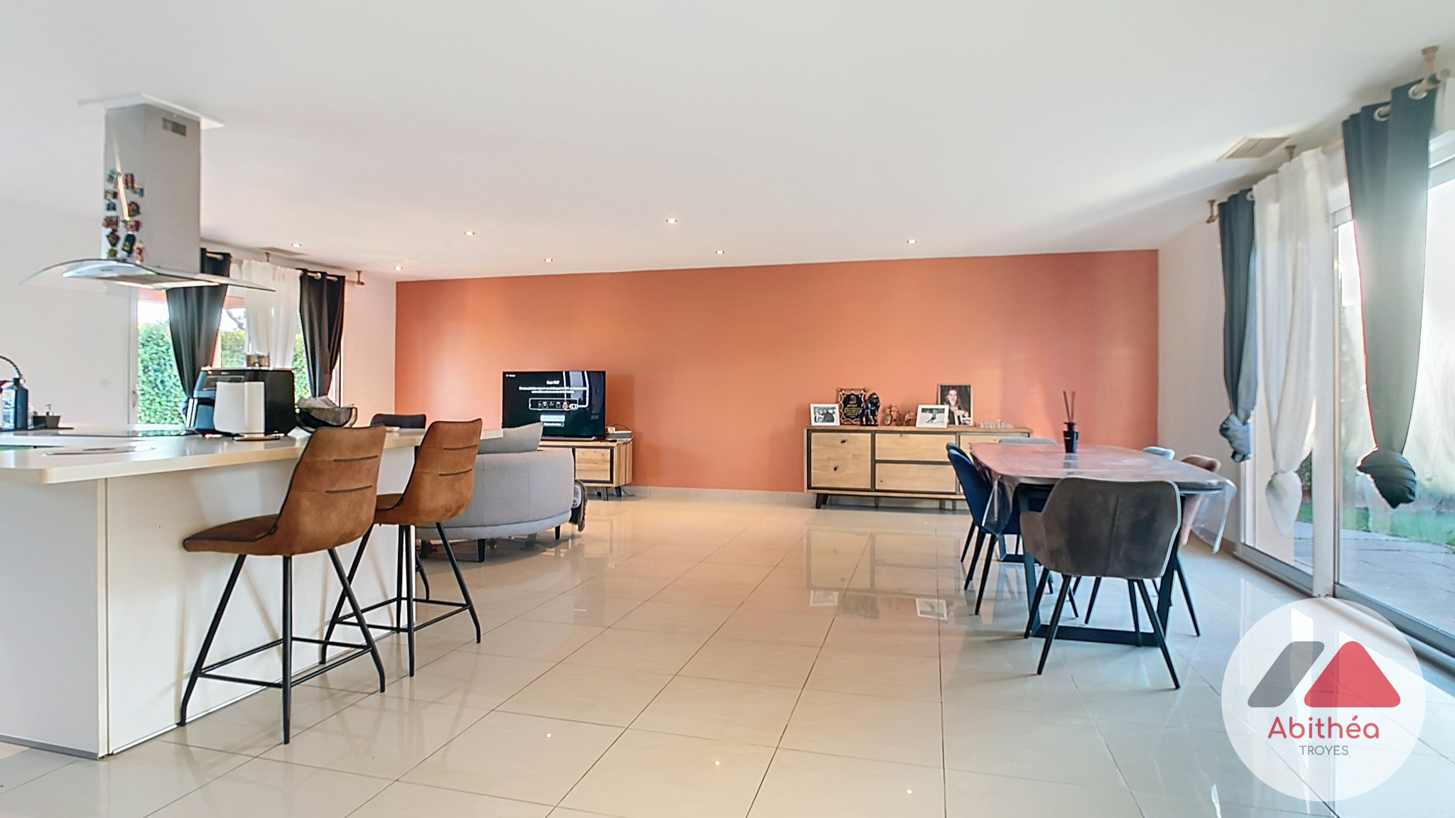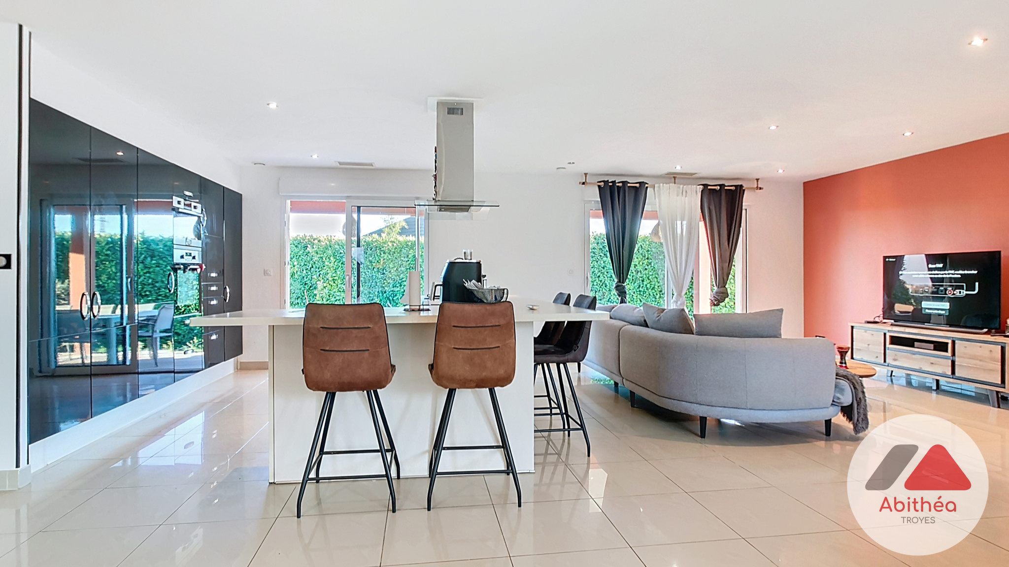 L'entrée s'ouvre sur une vaste pièce de vie lumineuse, avec une cuisine ouverte entièrement équipée. Profitez d'un accès direct à la terrasse et à la piscine semi-enterrée, sans vis-à-vis.