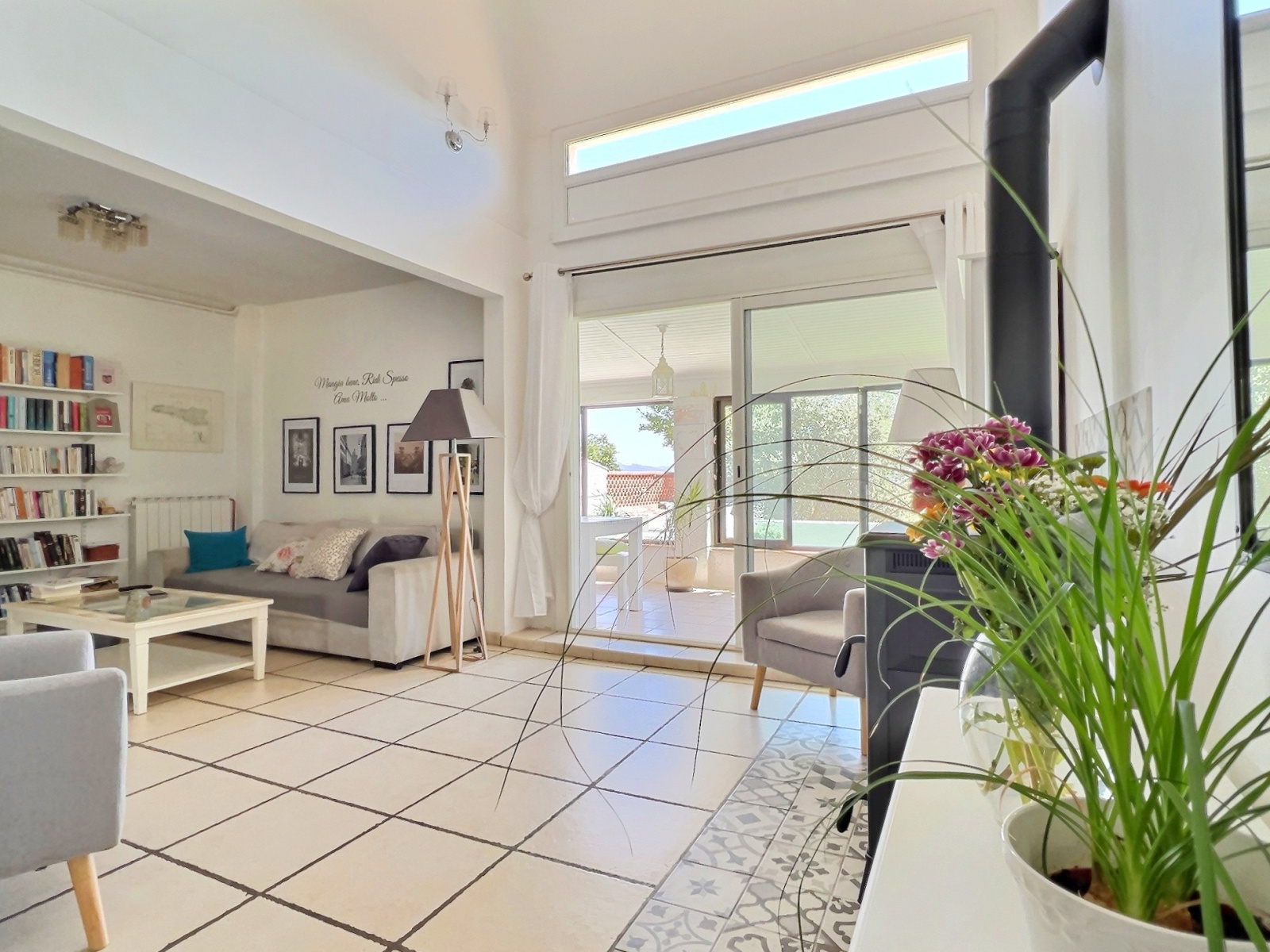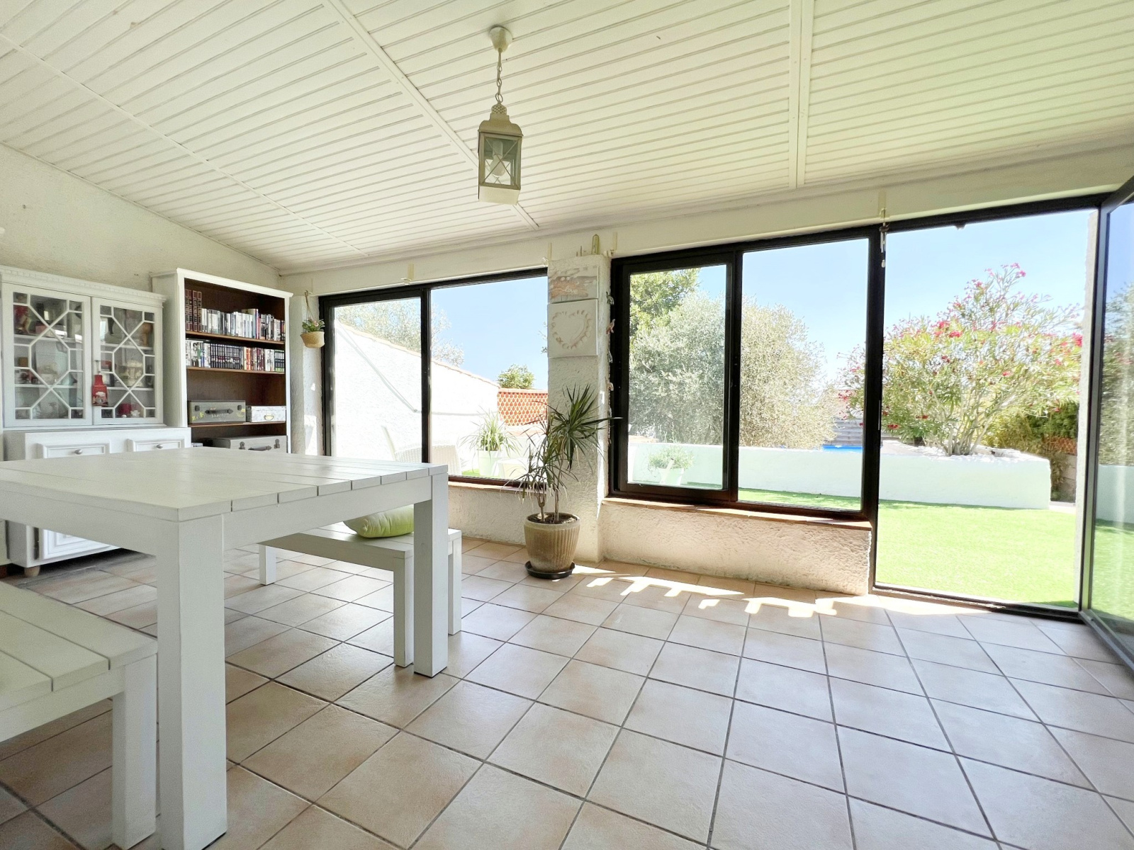 Cette villa possède au RDC une salle à manger, une spacieuse cuisine toute équipée donnant accès à la première terrasse côté nord, un WC indépendant, un lumineux salon séjour desservant une véranda de 15m2 ainsi que la deuxième terrasse et son jardin.