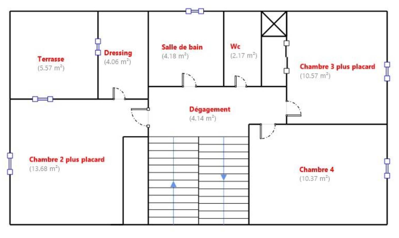 _ A l'étage, une chambre parentale de 14 m2 avec un espace terrasse privative, un dressing de 4 m2 avec rangements, de 2 chambres avec placard, d'une salle de bain, d'un wc séparé
