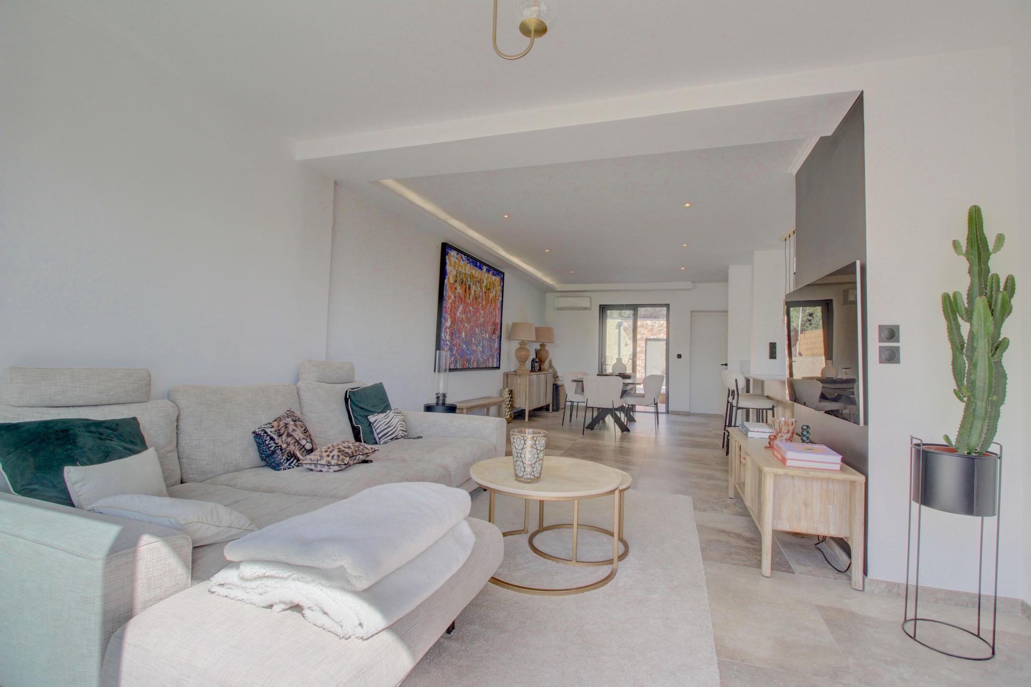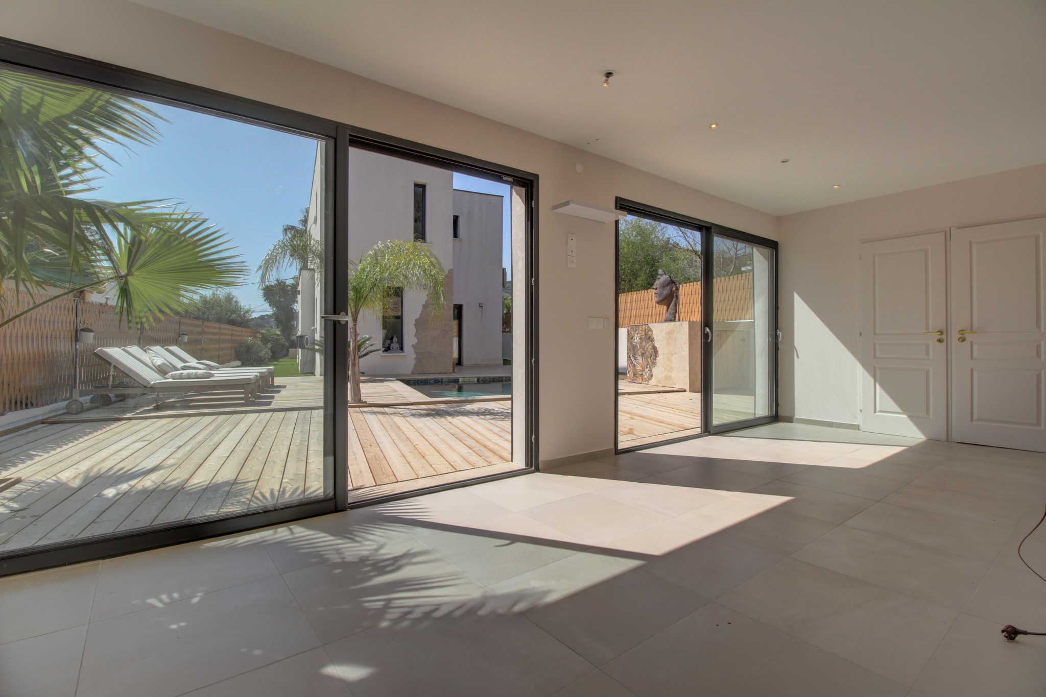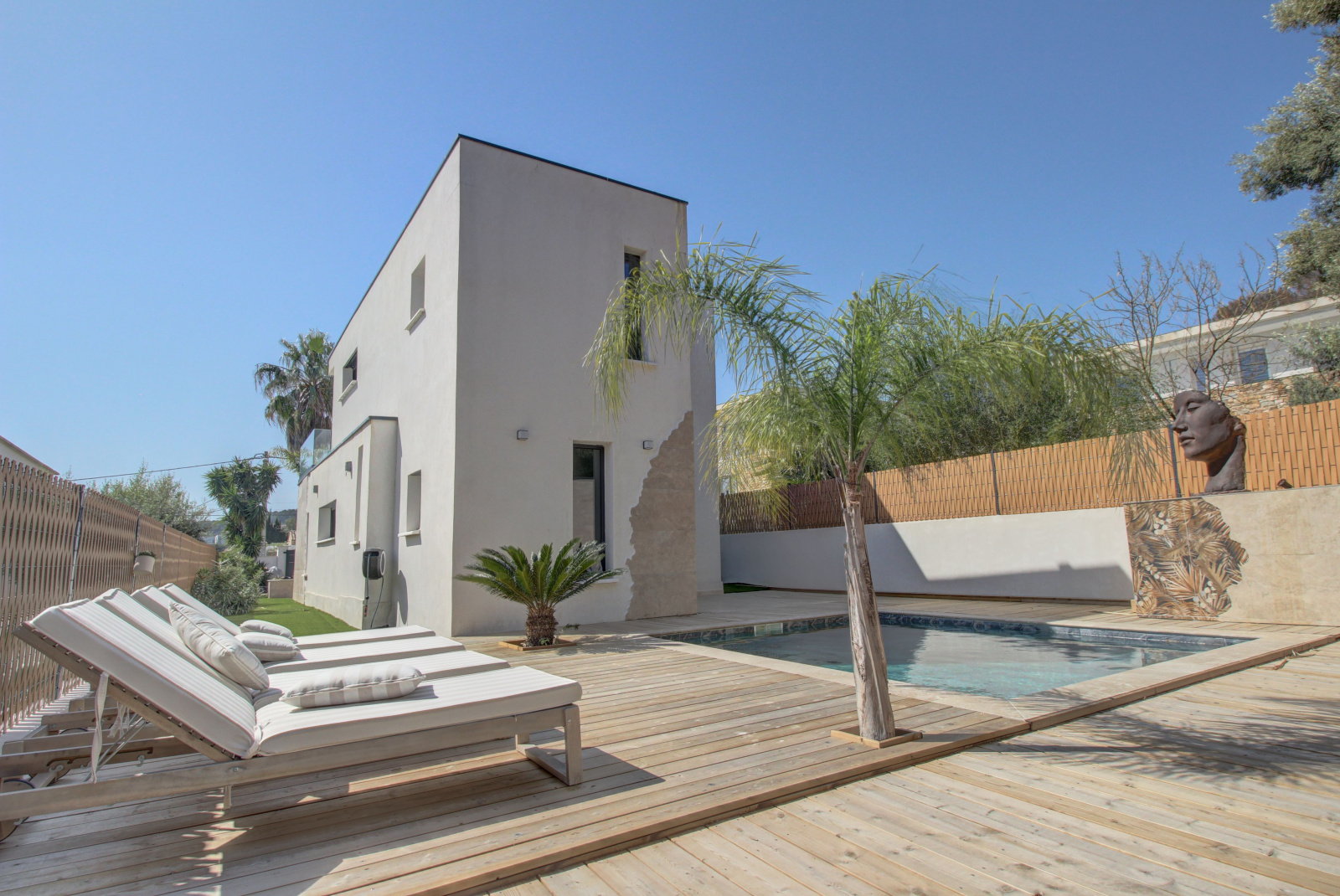 En extérieur, vous découvrirez un environnement soigneusement aménagé et une invitation à la détente avec une piscine avec terrasse en bois pour un espace de baignade élégant en profitant des beaux jours, un grand studio indépendant avec salle d'eau et climatisation parfait pour recevoir des amis, faire une salle de jeux ou une salle de sport, et la possibilité de garer 3 voitures sur le devant de la villa