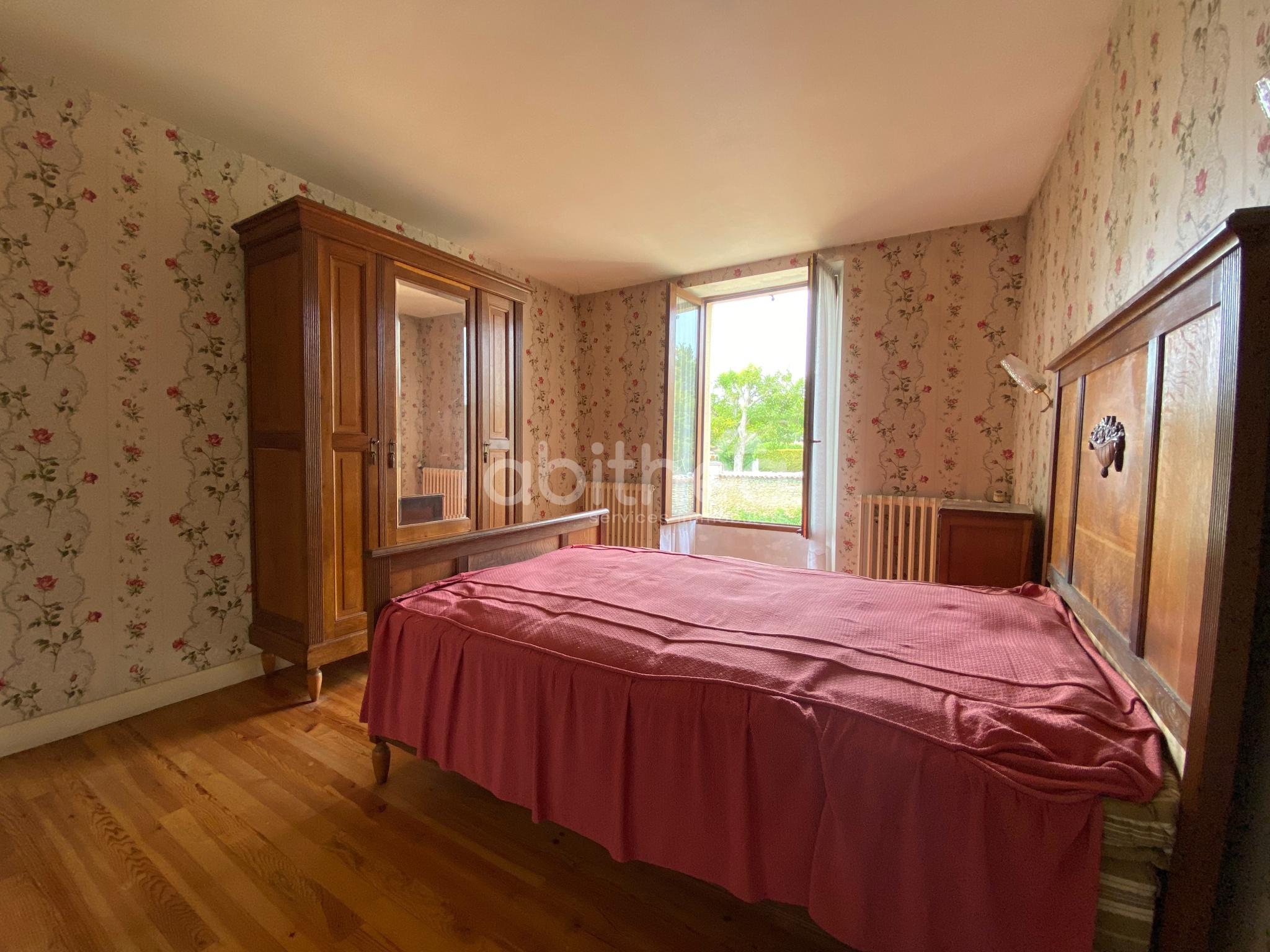 A l’étage un palier distribue un wc séparé, une salle de bains et trois chambres avec des parquets dont une de 26 m2.
