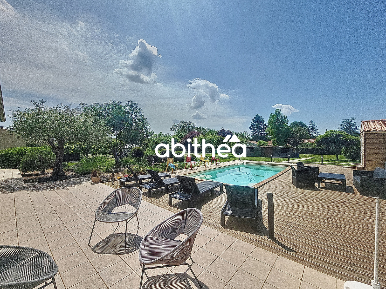 L'extérieur vous séduira avec son jardin paysagé et son verger . La terrasse carrelée exposée plein sud vous donnera un accès direct sur la piscine et sa terrasse bois.