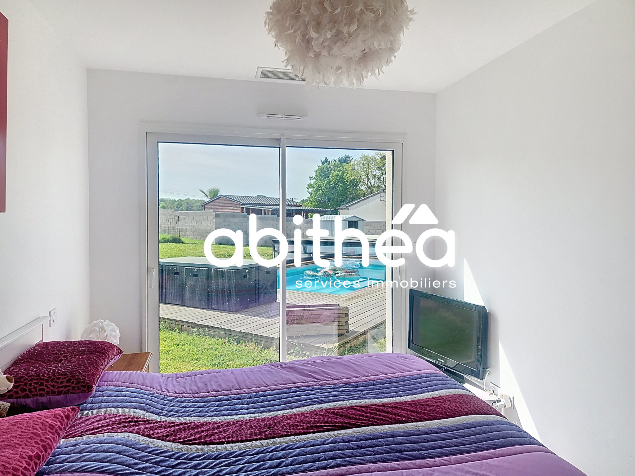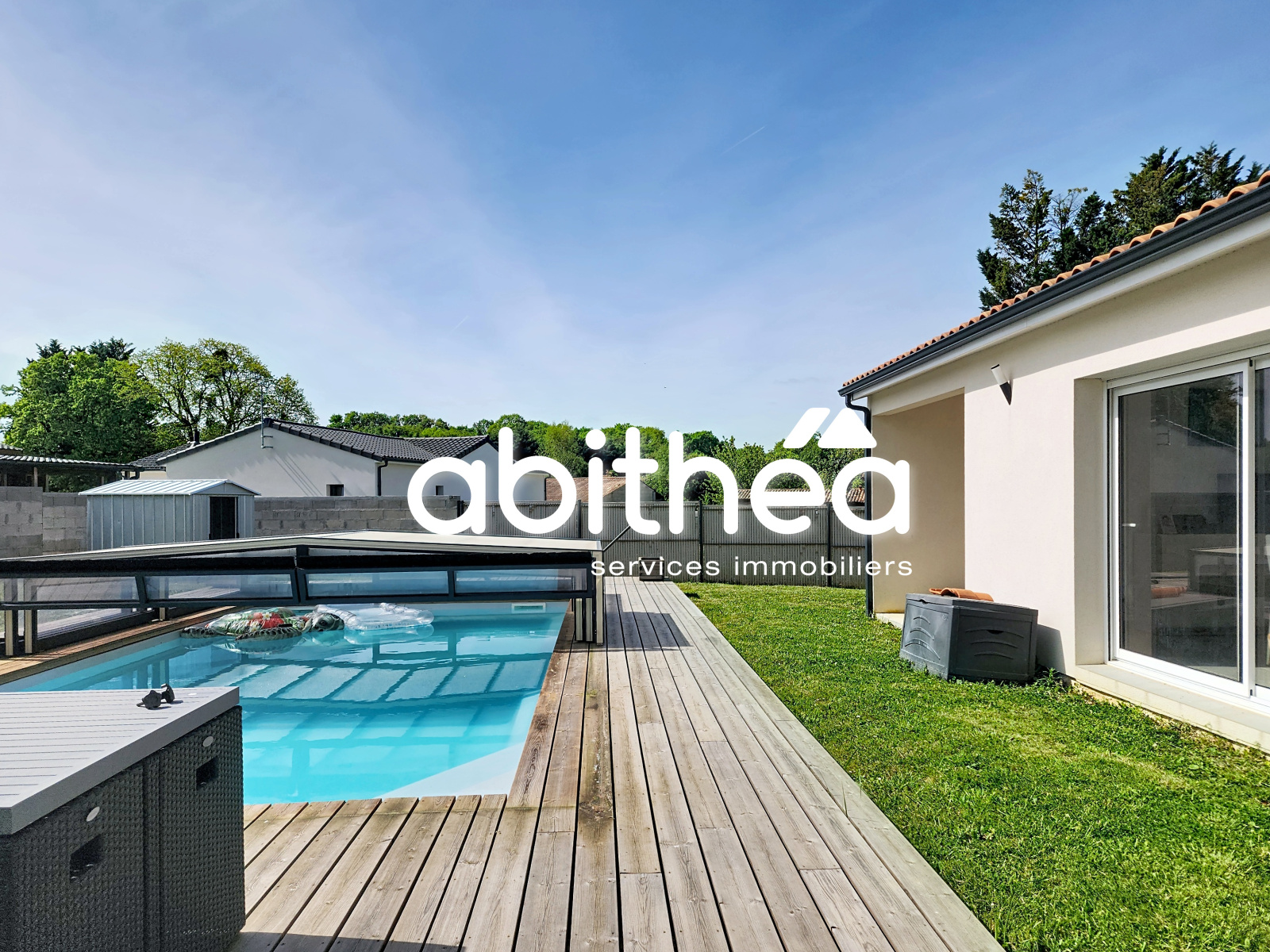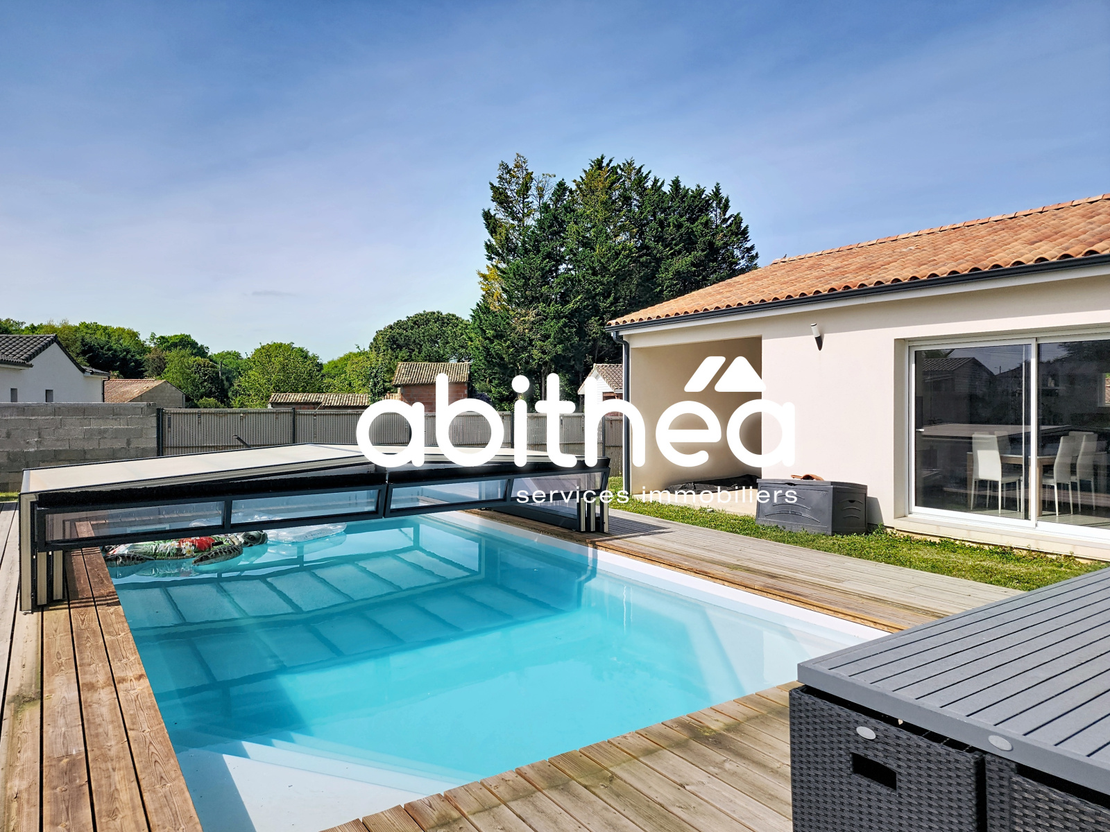 La terrasse bois de 60m² et la piscine 8x4 avec abri rétractable seront un vrai plus pour lprofiter pleinement des extérieurs. La piscine est accessible de la pièce à vivre ainsi que de la chambre parentale, un vrai plaisir dès lors que l'on ouvre les yeux le matin.