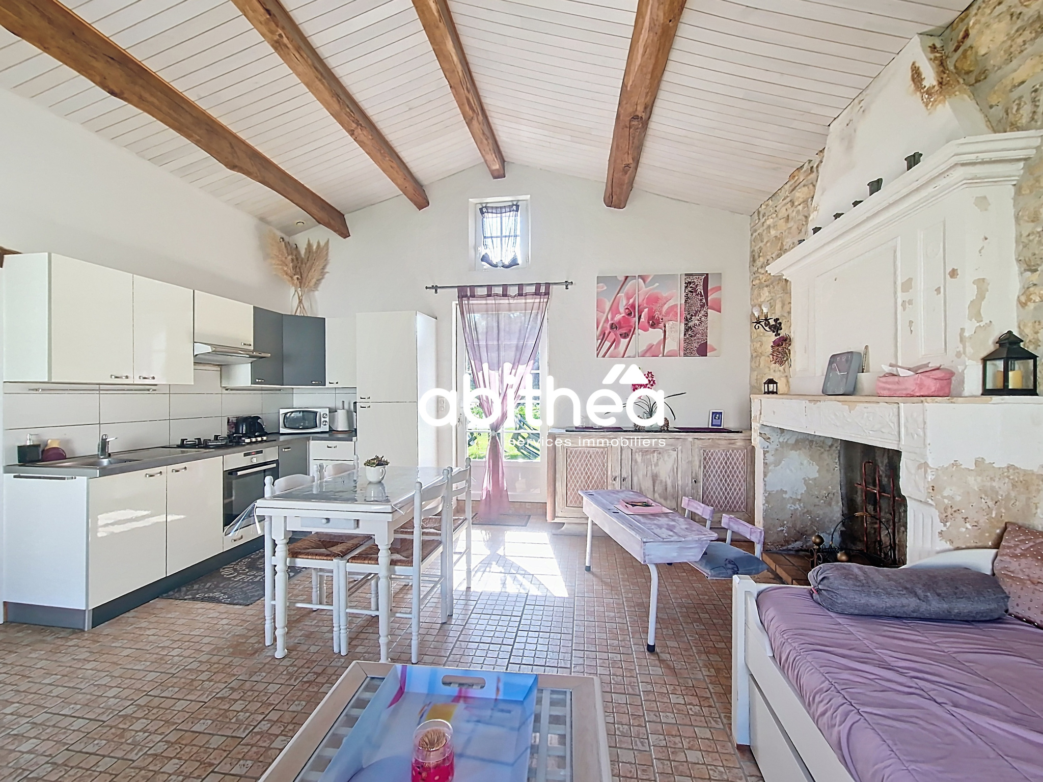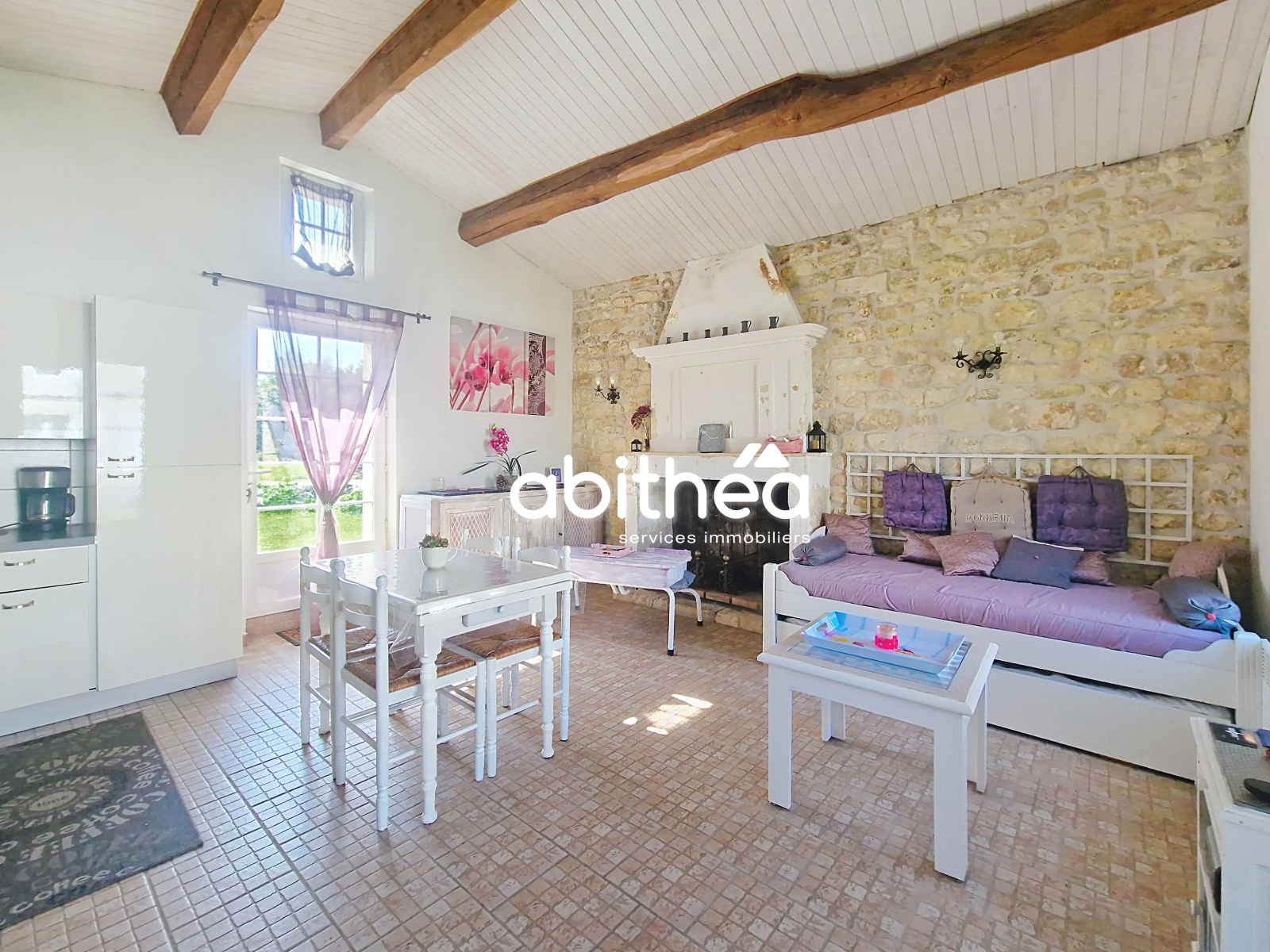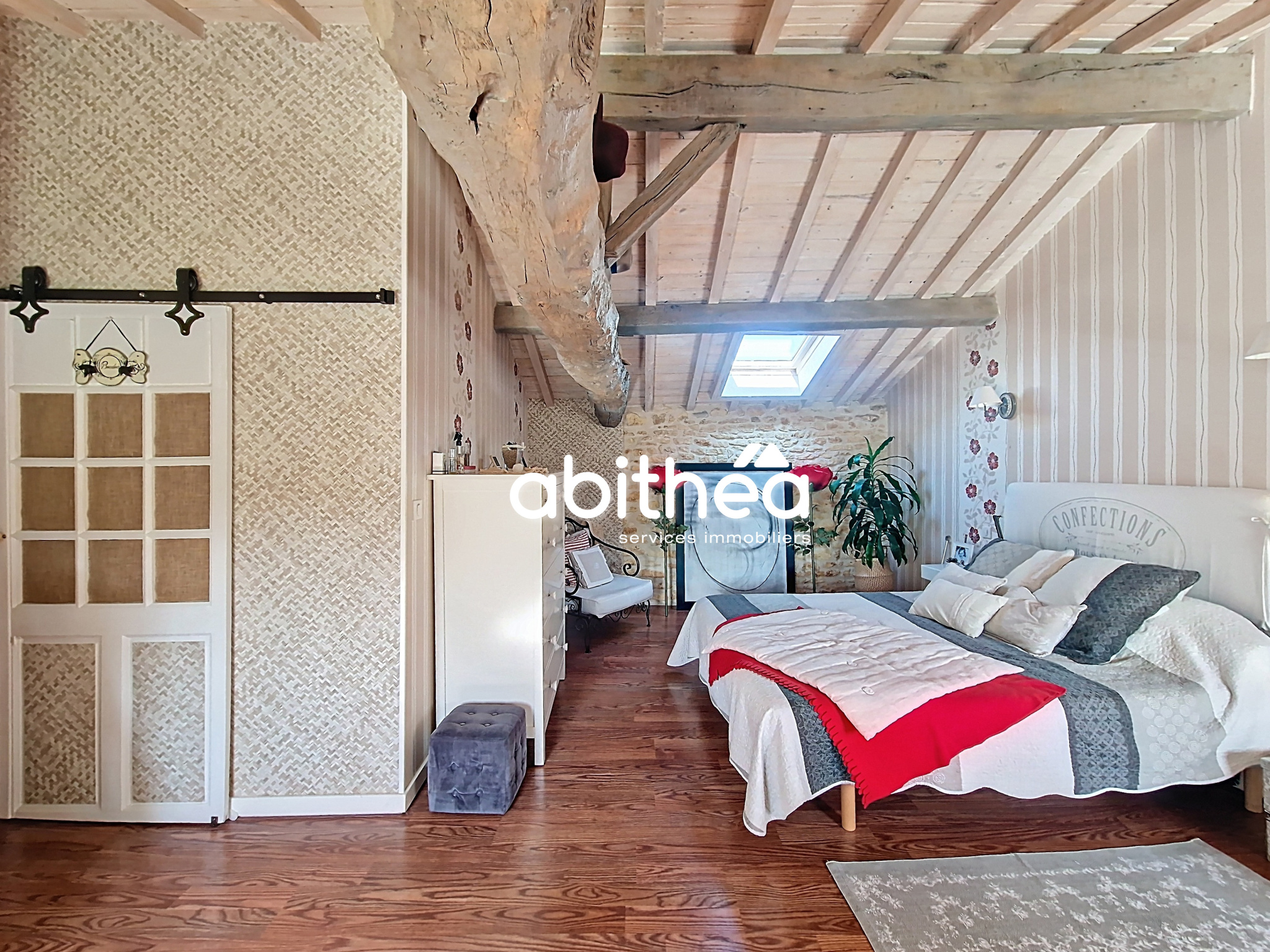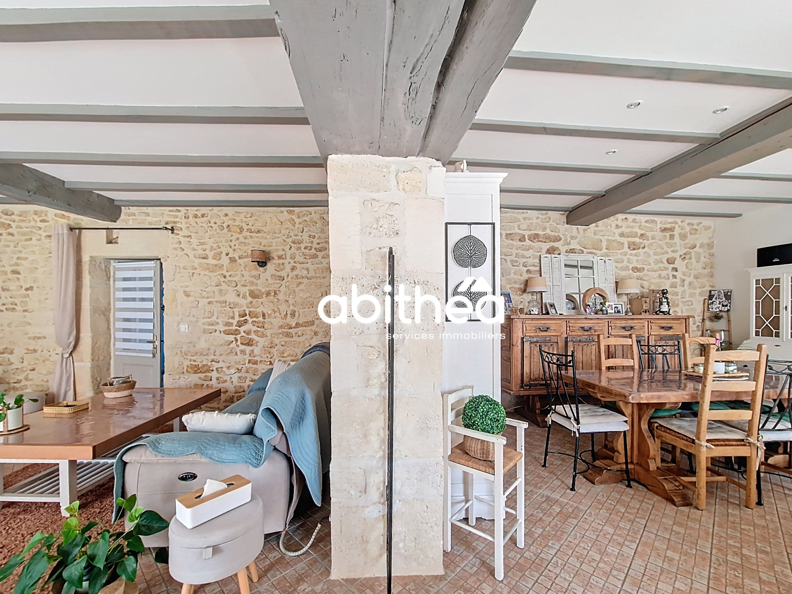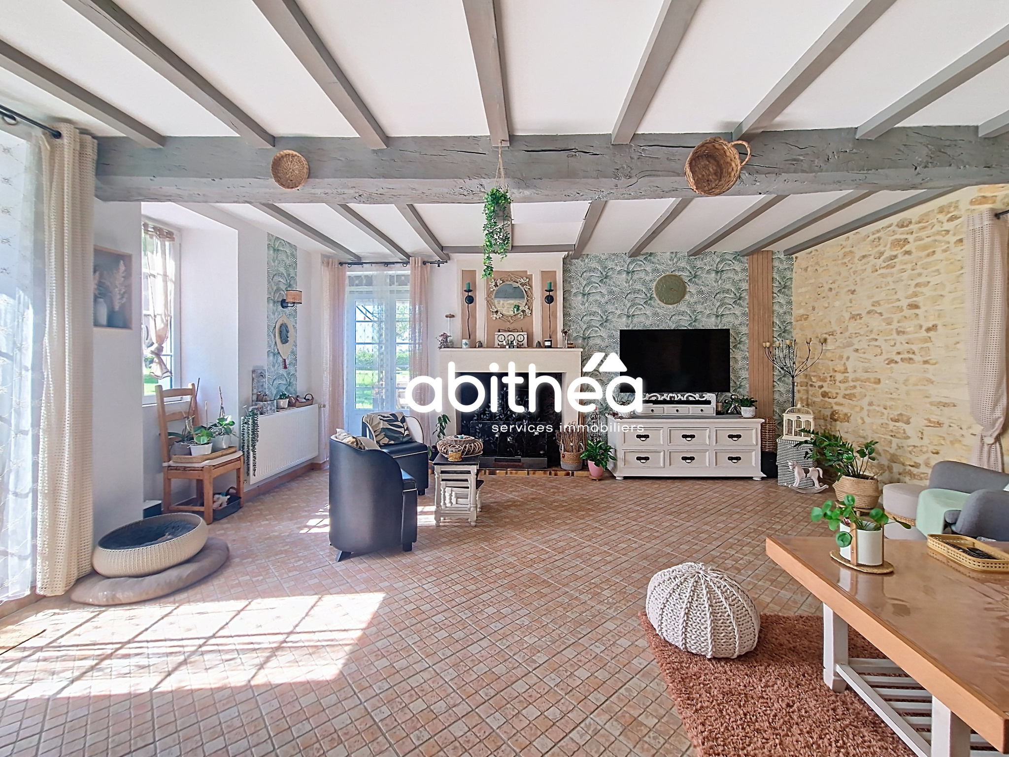 - d'un grand salon lumineux de 33m², à l'esprit chaleureux autant par les poutres, que par les moellons apparents ou la cheminée centrale.