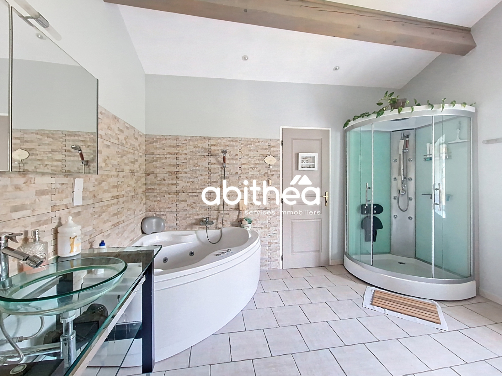 - une spacieuse salle de bains familiale avec baignoire, douche et double vasque, menant