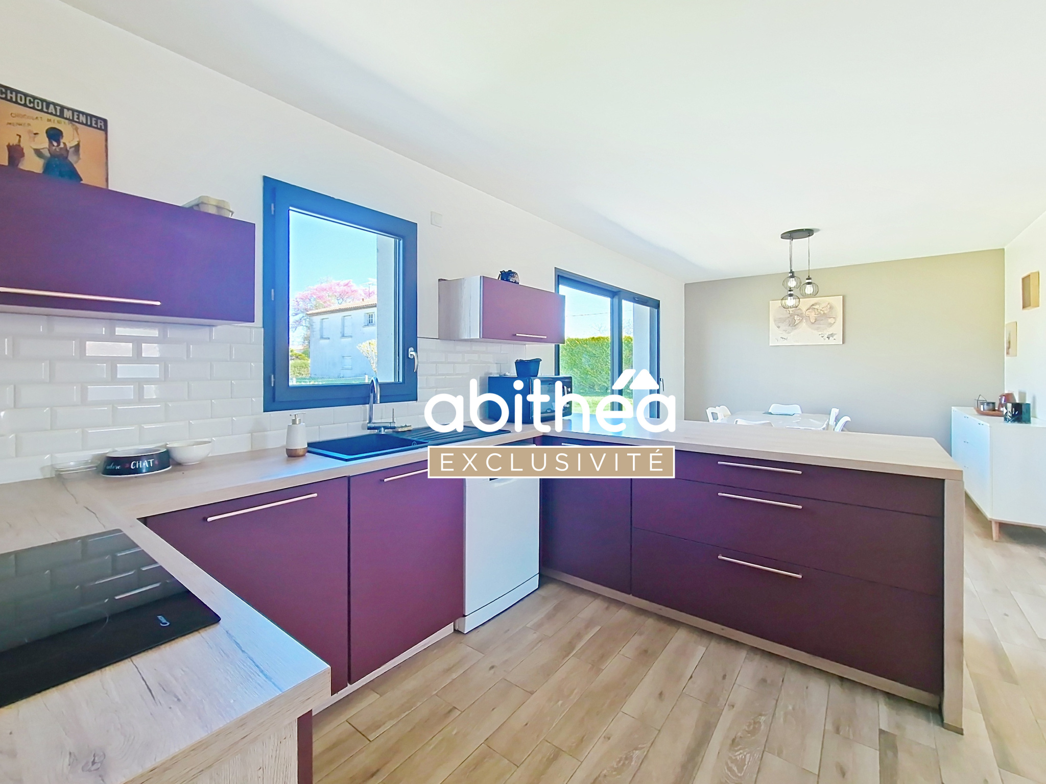 La cuisine ouverte, aménagée et équipée, séduit par son généreux plan de travail et son espace bar, idéal pour partager des moments en famille ou entre amis.