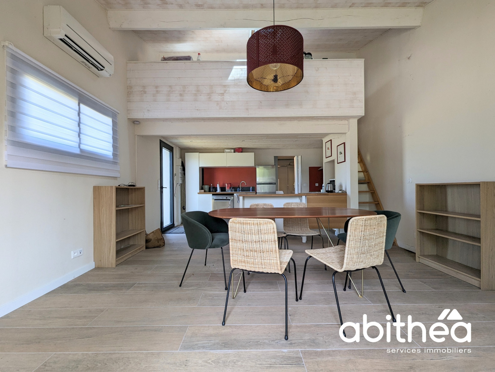 Cette maison est composée d'une pièce à vivre avec cuisine ouverte équipée donnant accès à deux terrasses accssibles par deux baies vitrées, une chambre et une salle d'eau de plain pied et une seconde chambre d'appoint en mezzanine.
