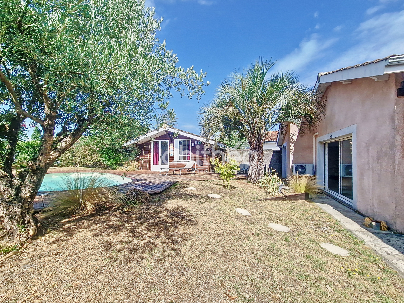 Le jardin arboré orienté sud vous propose une terrasse bois bordant la piscine de 8x3m (liner neuf) ainsi qu'un chalet bois accueillant la partie technique de celle-ci.