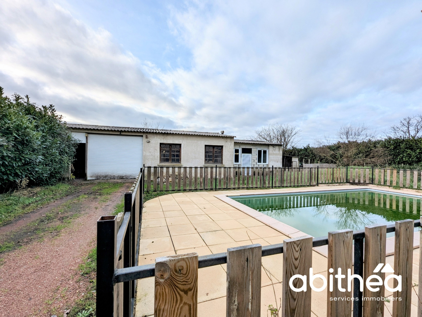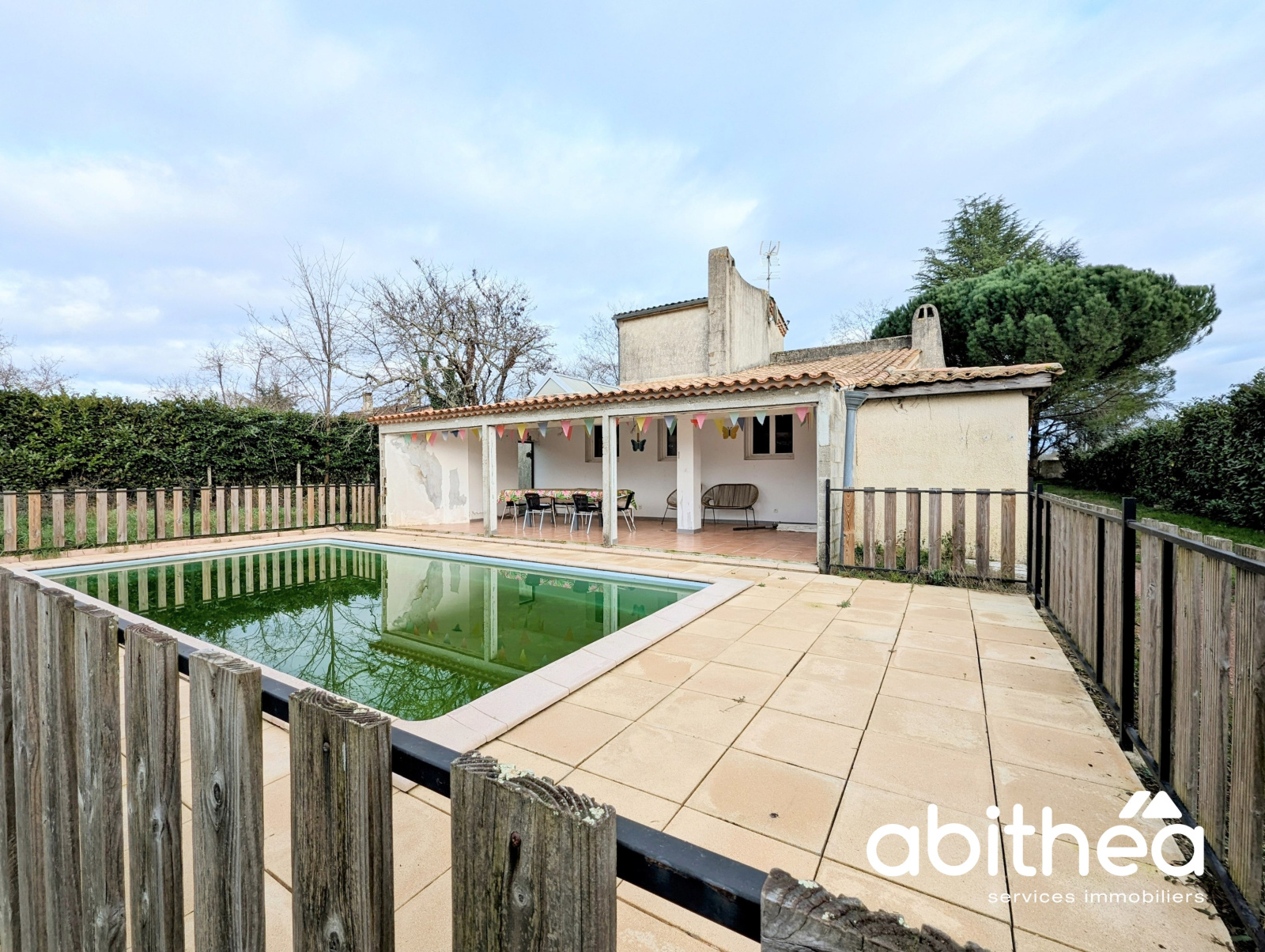 Pour finir de vous combler, cette maison dispose d'une piscine (ne vous fiez pas à la photo car elle est en hivernage) attenante à une terrasse couverte en accès direct depuis la maison.