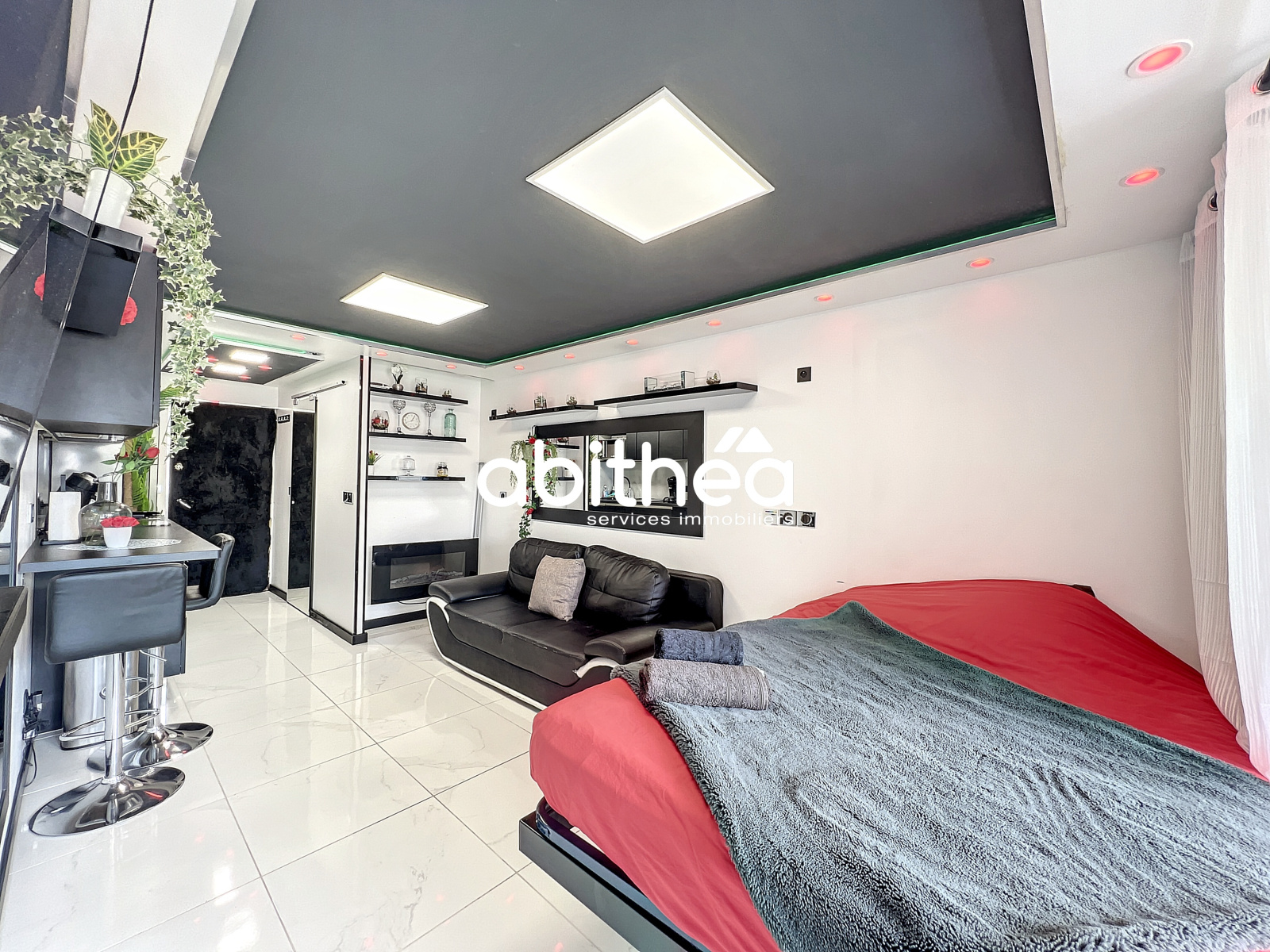 Le salon et la chambre partagent un espace chaleureux, agrémenté d’un grand écran TV et d’un chauffage au style feu de bois, pour une ambiance cosy et conviviale. La loggia spacieuse baigne l’appartement de lumière naturelle, offrant un véritable plus pour profiter pleinement de cet espace.