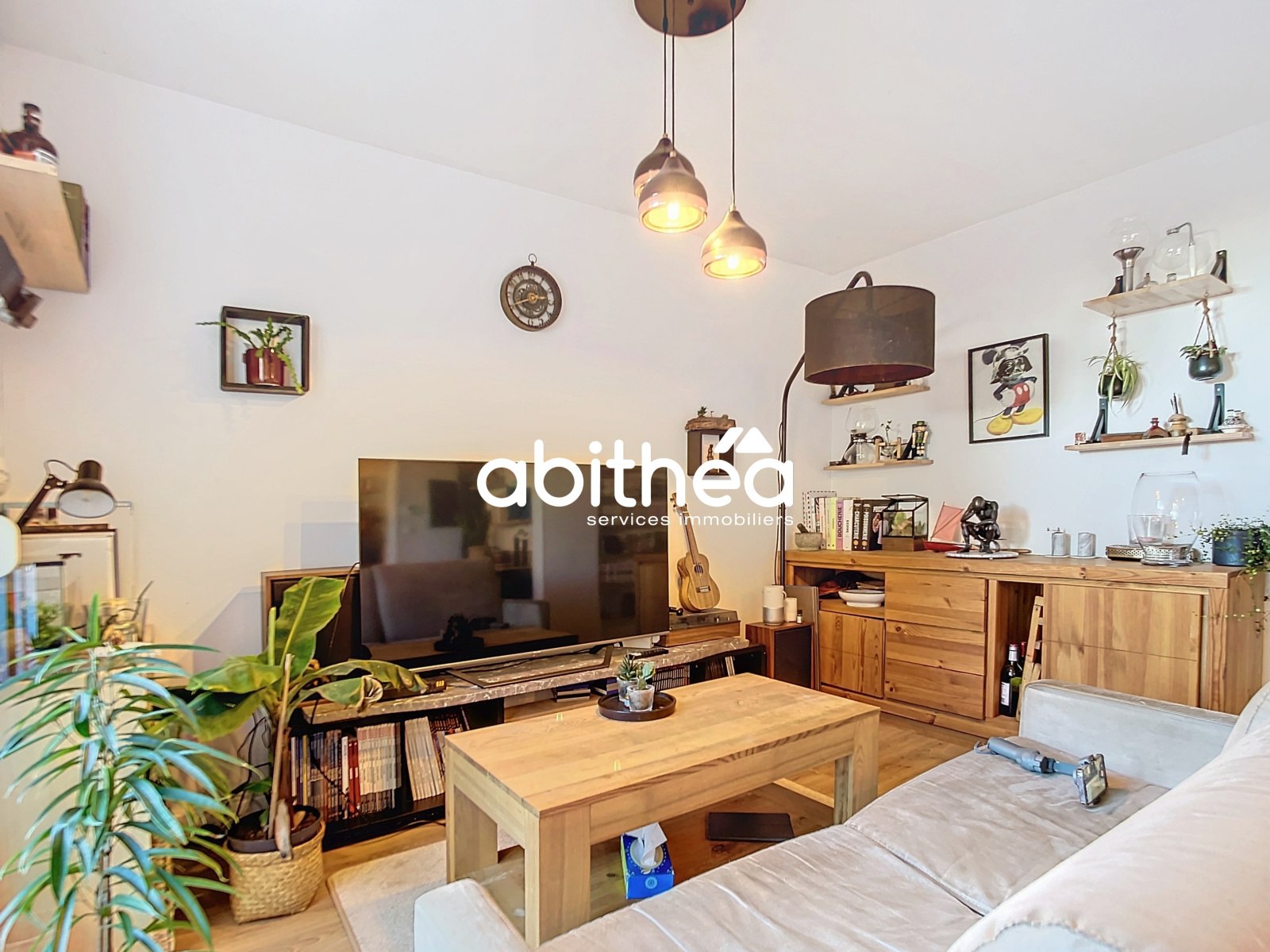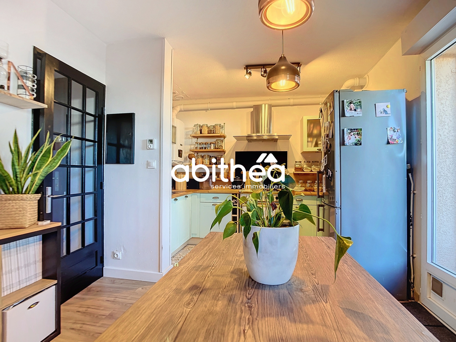 Une entrée avec grand placard, une pièce de vie de preque 25 m² avec salon, coin salle à manger et cuisine aménagée et équipée. Le séjour est joliment décoré et avec baies vitrées pour offrir une belle luminosité à cet espace de vie.