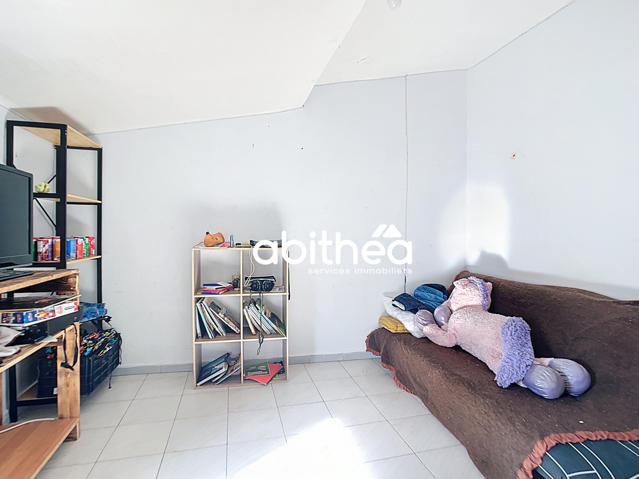 Séjour avec cuisine semi-séparée.