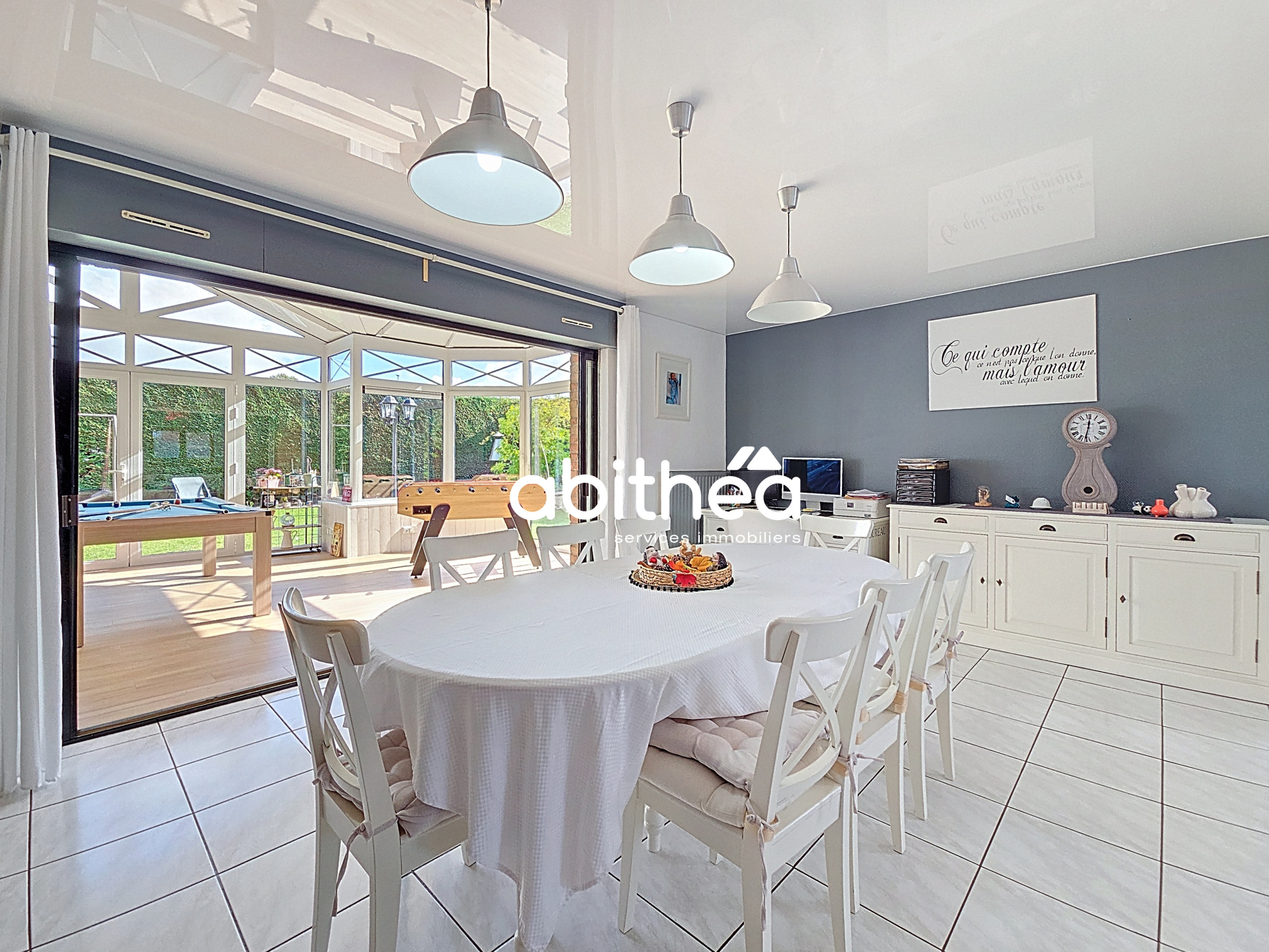 Le rez-de-chaussée accueille une vaste pièce de vie de plus de 40 m², lumineuse et équipée d’un poêle à granulés. Une baie vitrée à galandage ouvre cet espace sur une véranda de plus de 30 m², dotée d’un chauffage au sol, offrant un lieu de vie supplémentaire utilisable toute l’année.