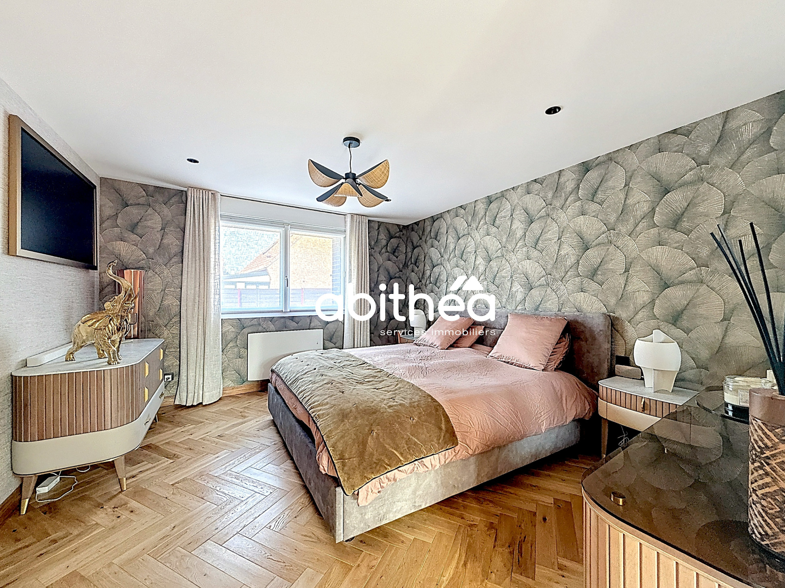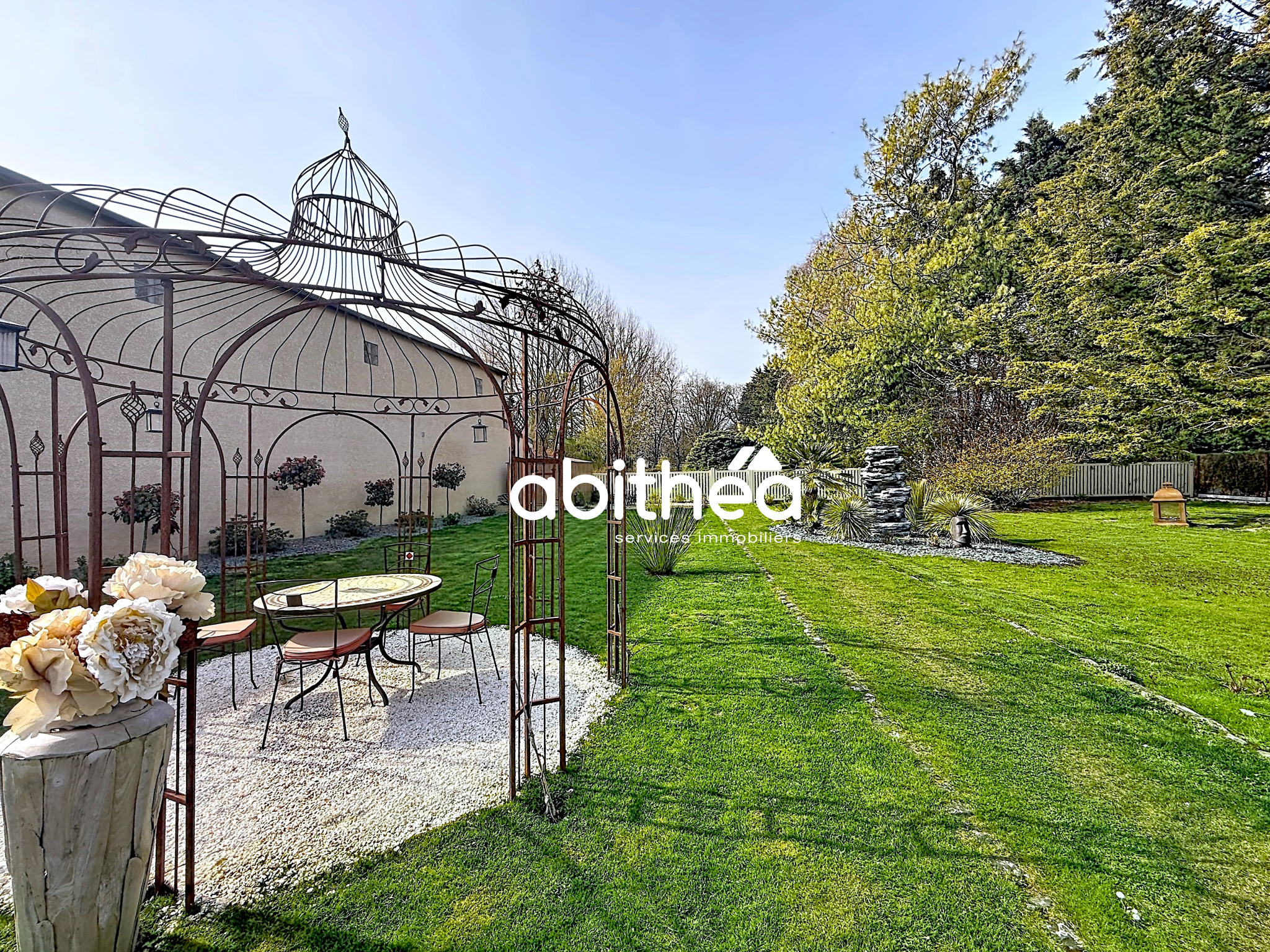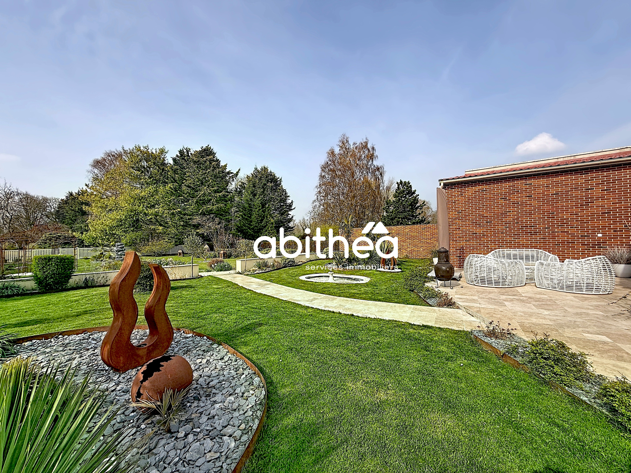 Dès l’extérieur, le ton est donné avec un jardin entièrement paysager, structuré avec soin, mêlant perspectives végétales, espaces minéraux et touches exotiques, créant une atmosphère aussi esthétique qu’apaisante. L’ensemble est clos et arboré, pensé comme un véritable prolongement de la maison.