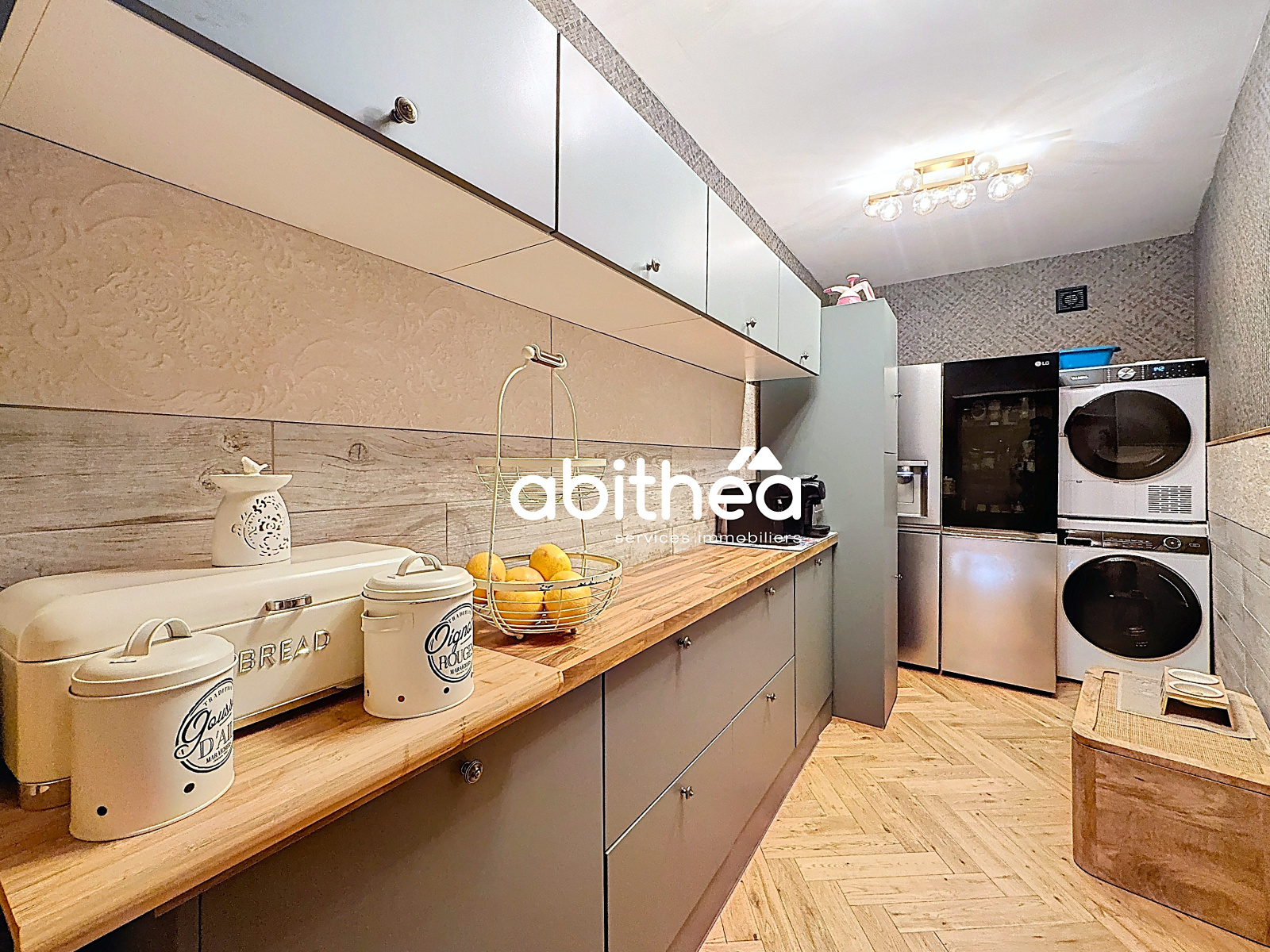 La cuisine aménagée et équipée de 20,62 m², pensée avec exigence, offre des lignes élégantes, des plans de travail généreux et de belles ouvertures sur l’extérieur.