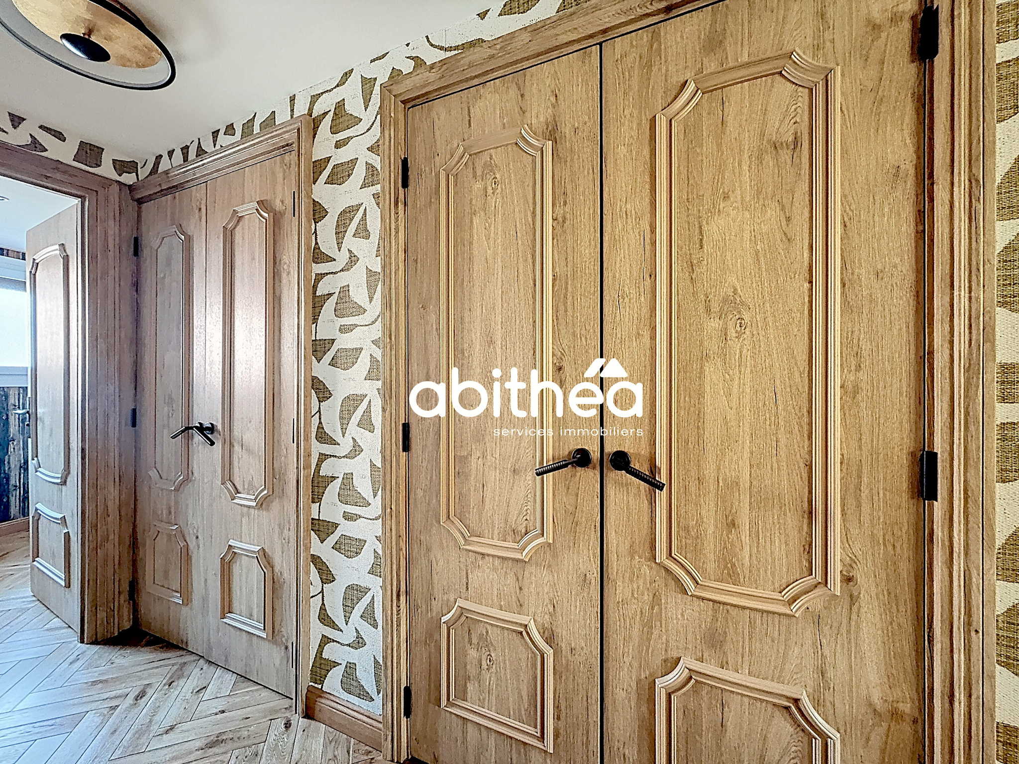L’entrée dévoile immédiatement le caractère du lieu avec un parquet massif en chevrons, fil conducteur que l’on retrouve dans la cuisine, la salle à manger et le jardin d’hiver, apportant une vraie cohérence architecturale. Les volumes sont généreux, les circulations fluides et chaque espace semble dialoguer naturellement avec le suivant.
