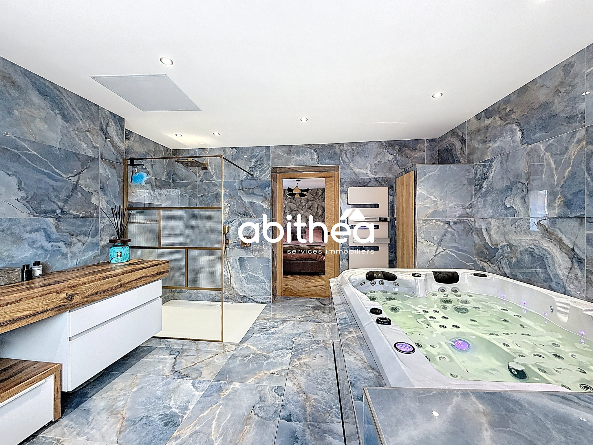 Le rez-de-chaussée propose également une suite avec salle de bain et jacuzzi, véritable espace de bien-être. Cette dernière se distingue par ses finitions haut de gamme en marbre italien gris bleuté aux veinages marqués, apportant une dimension à la fois minérale et contemporaine.