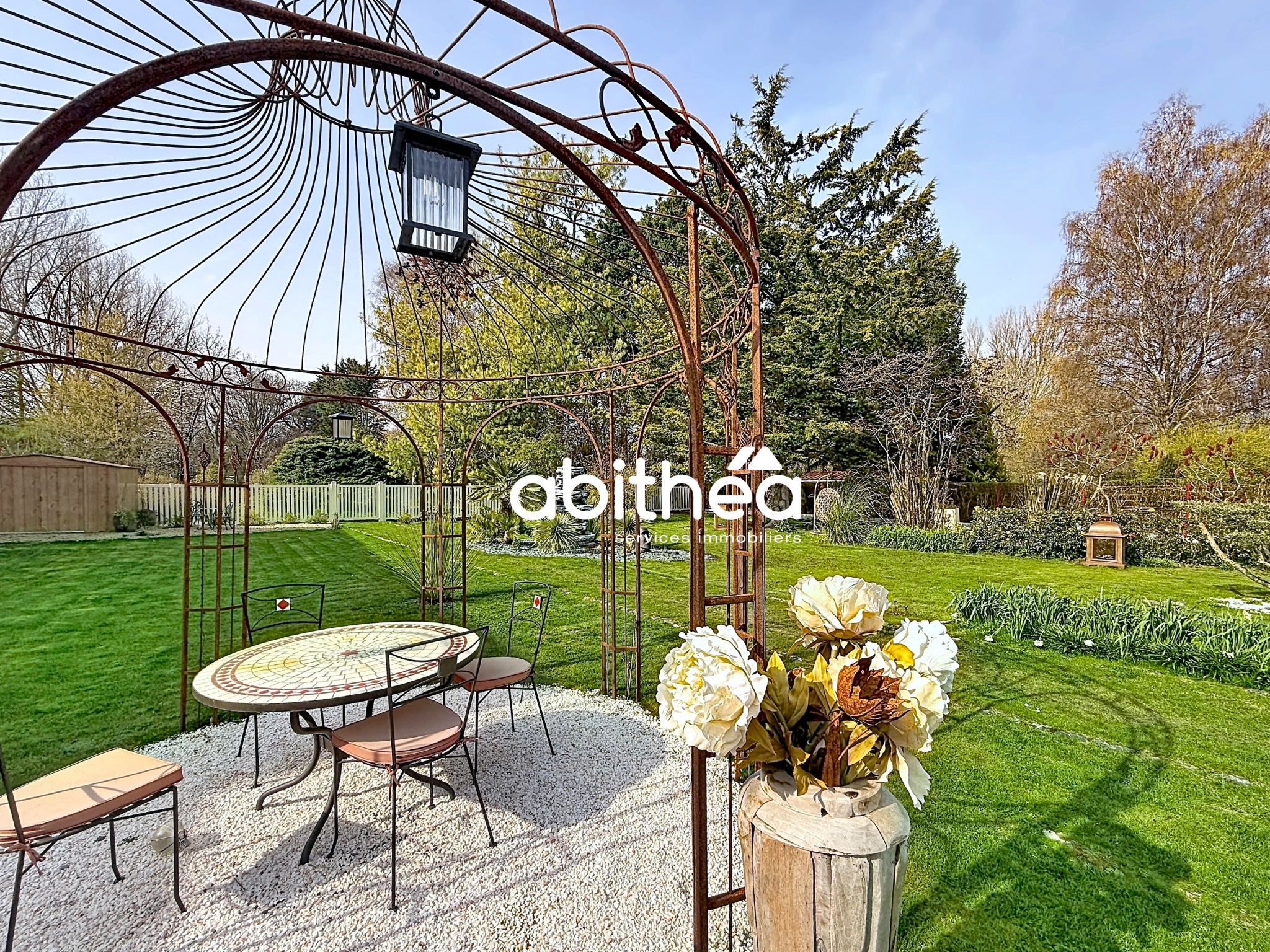 À l’extérieur, le jardin se prolonge avec élégance, intégrant différents espaces de vie, une terrasse, ainsi que des dépendances comprenant un atelier, un chalet.