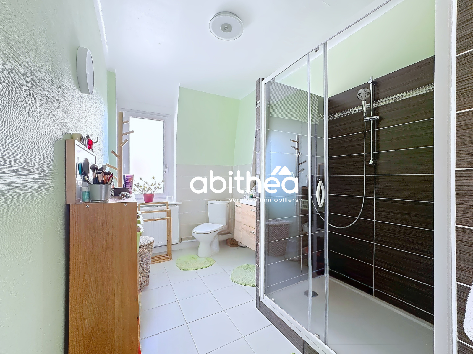 Le rez-de-chaussée comprend également une salle de douche ainsi qu’un WC.