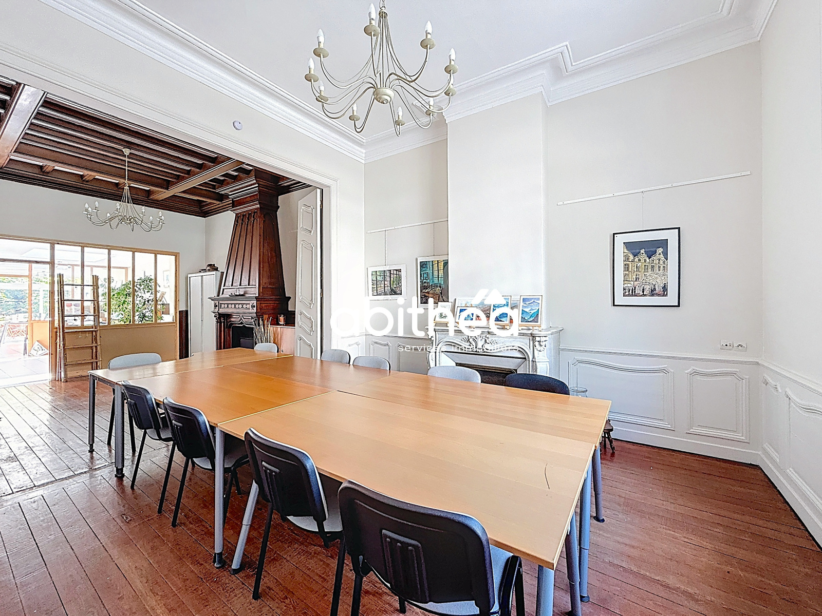 Ce superbe rez-de-jardin propose de belles prestations, à l'image de la conservation des cheminée en marbre et bois, avec de sublimes poutres décoratives et portes travaillées en bois, où vous pouvez imaginer y faire votre salon. Les menuiseries ont elles aussi été sauvegardées : un survitrage en PVC a été installé pour atténuer le bruit pouvant provenir de l'extérieur et limiter les déperditions de chaleur.