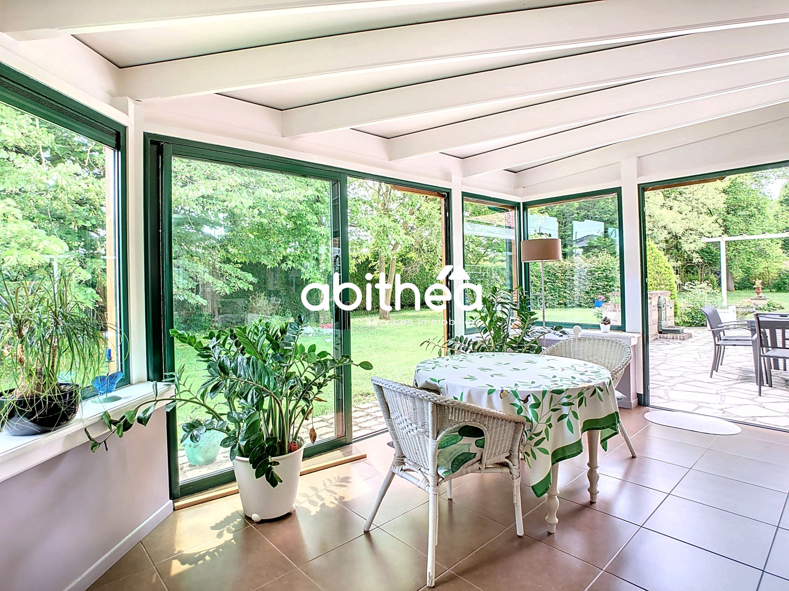 Une jolie entrée dessert un salon séjour de 43 m2 avec de beaux éléments (parquet, cheminée, ..) avec vue imprenable sur un jardin arboré et entretenu, rien de tel pour se détendre et recevoir agréablement. Une cuisine équipée de bonne taille s'intégre très bien dans le style de la maison et s'ouvre sur une incroyable véranda de 60 m2 établie en 2008.