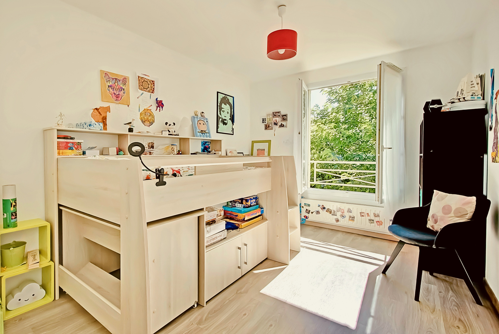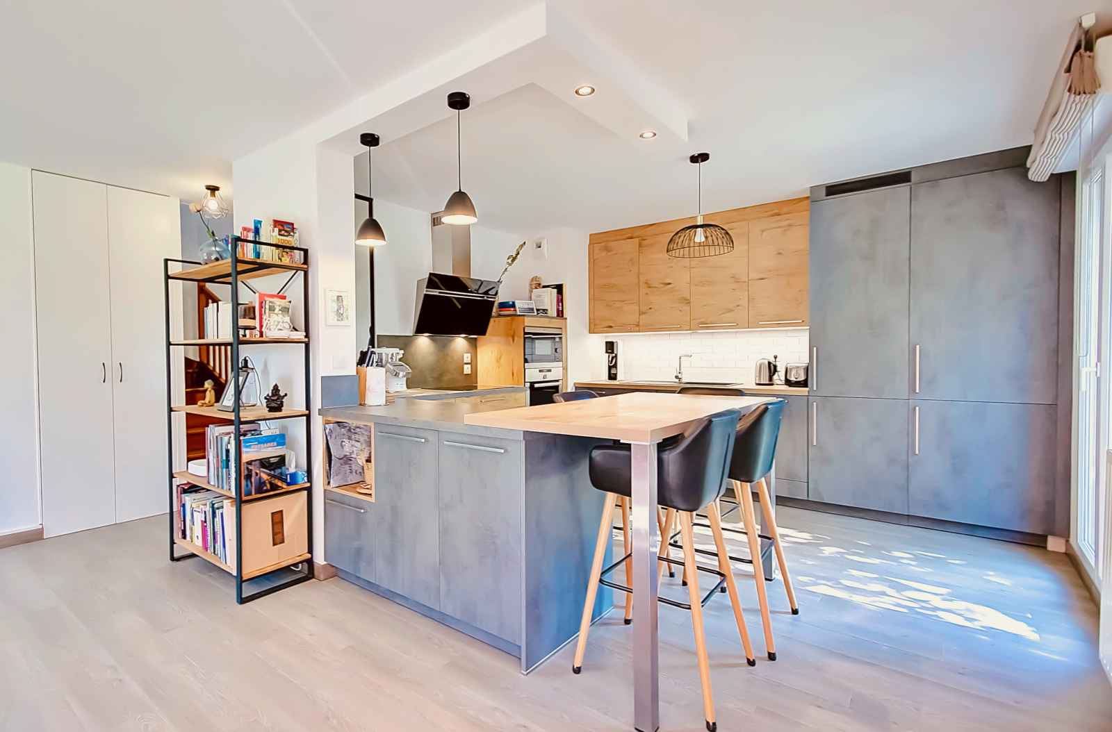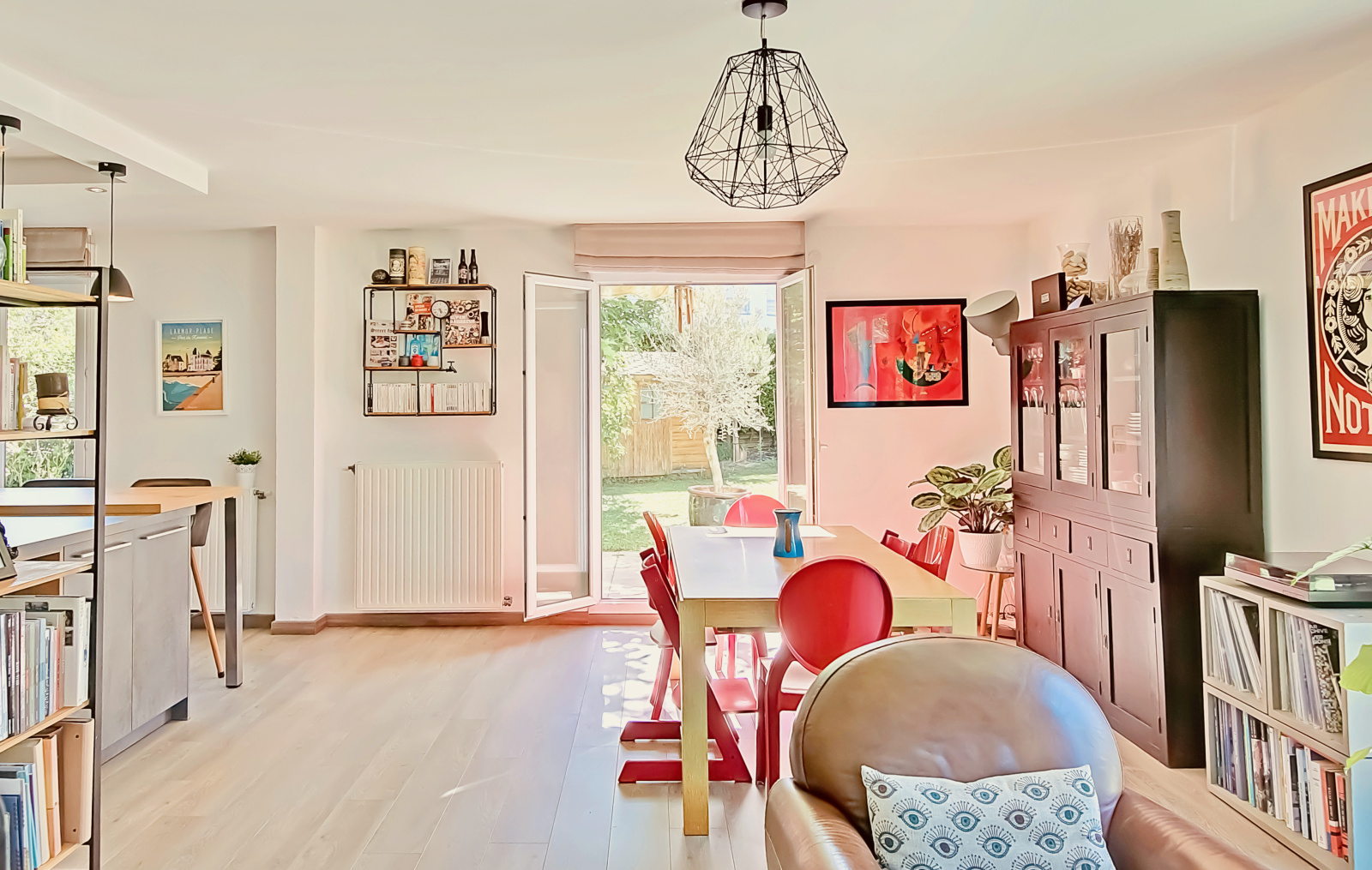 Au rez-de-chaussée, elle se compose d'une grande pièce de vie d'environ 44 m² avec cuisine ouverte récente et entièrement équipée, d'un bureau et de nombreux rangements.