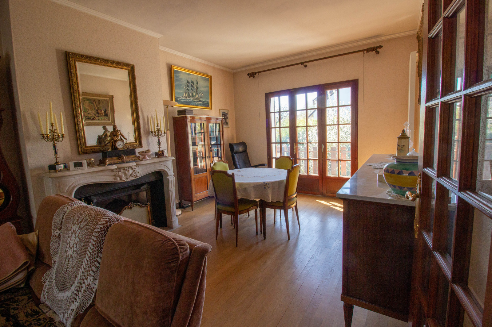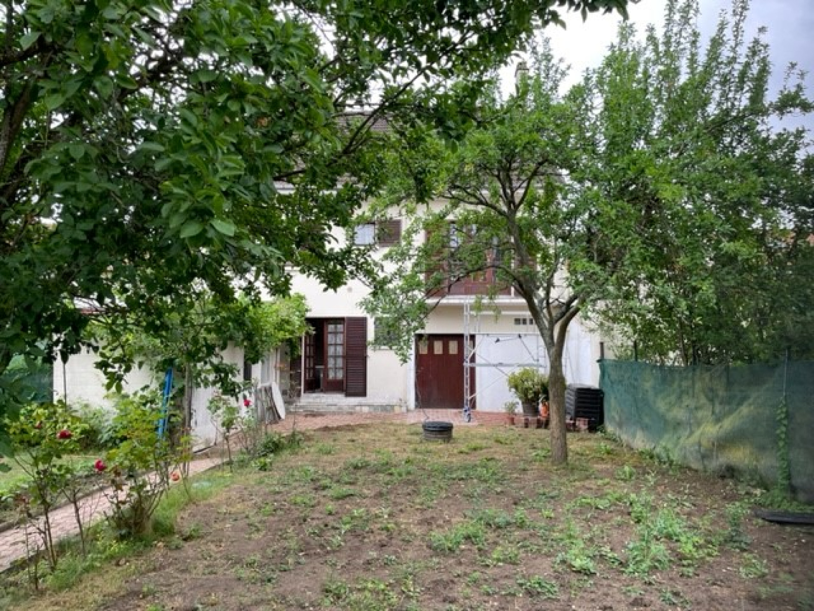 Rez de jardin aménagé en pièce de vie avec cheminée, cuisine d'été, garage de 40 m² avec belle hauteur de plafond