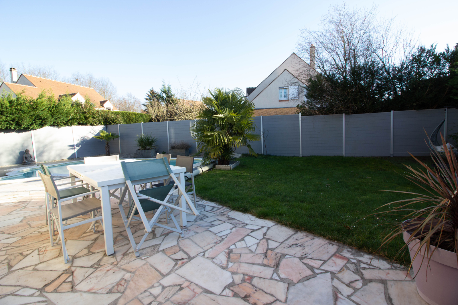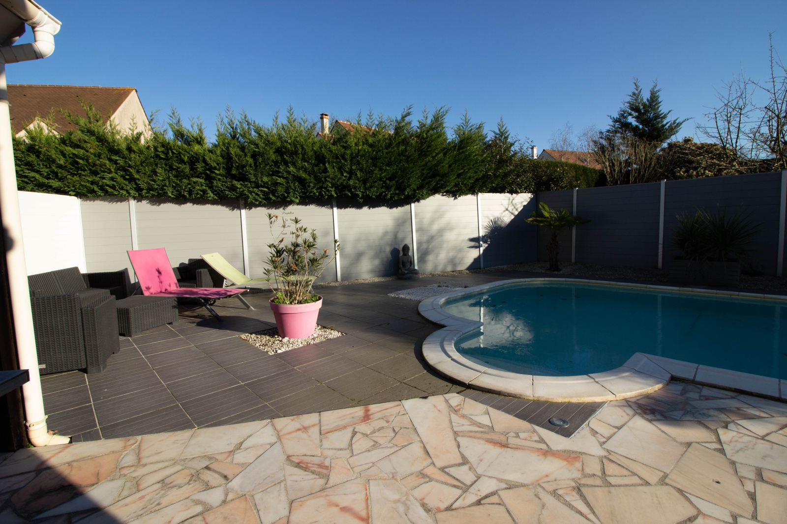 La pièce principale est baignée de lumière et donne sur le jardin ou une piscine avec espace détente à l abri des regards vous tend les bras.